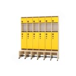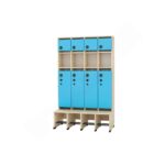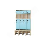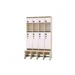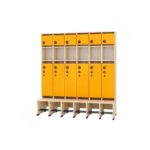 Die separaten, farbigen Türen (Artikelnummern 855533-855542 für groß und 855523-855532 für klein) sorgen mit ihren leise schließenden Scharnieren für ein sanftes Öffnen und Schließen. Im Mittelbereich können keine Türen angebracht werden, da dort keine Vorbohrungen vorhanden sind. Dreifach-Haken sind separat bestellbar und bieten zusätzlichen Platz für die Garderobe.