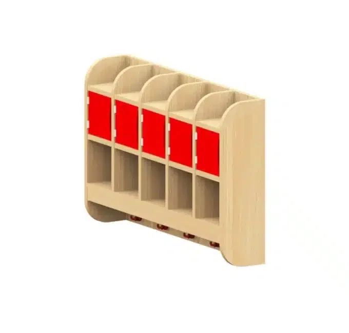 Unsere Garderobendoppelablage ist die perfekte Kombination aus Funktionalität und durchdachtem Design, um den Garderobenbereich in Kindergärten und Schulen optimal zu organisieren. Pro Platz bietet diese vielseitige Lösung ein Elternfach oben, ein mittleres Fach mit Tür (links oder rechts) und Griffschlitz sowie ein offenes Fach. Zusätzlich sorgen je ein Zweifach- und Dreifachhaken für die sichere Aufbewahrung von Jacken, Taschen und weiteren persönlichen Gegenständen.
