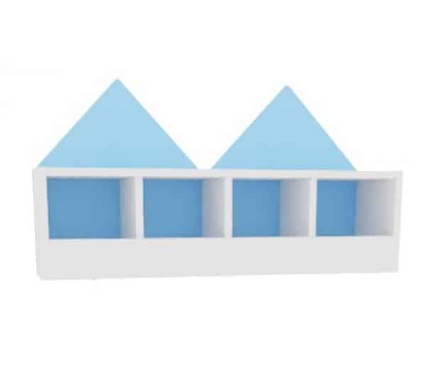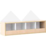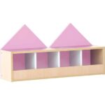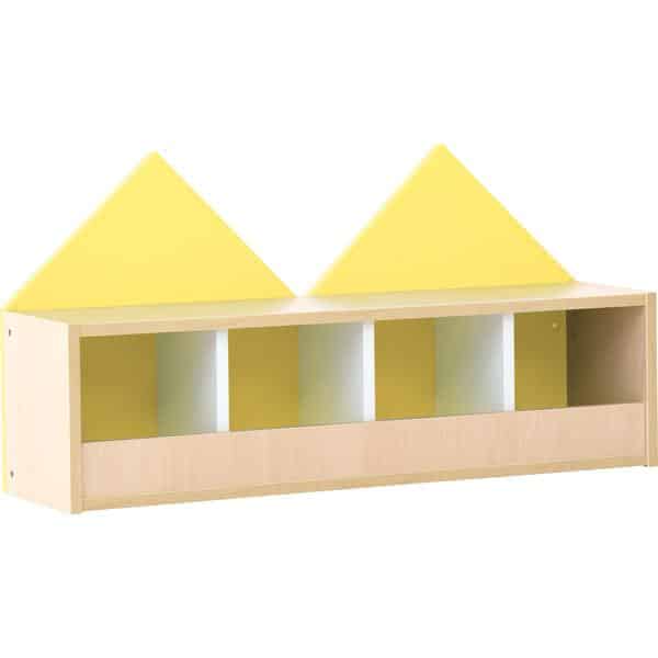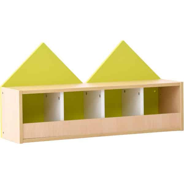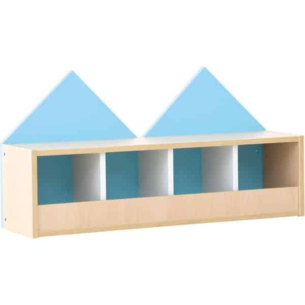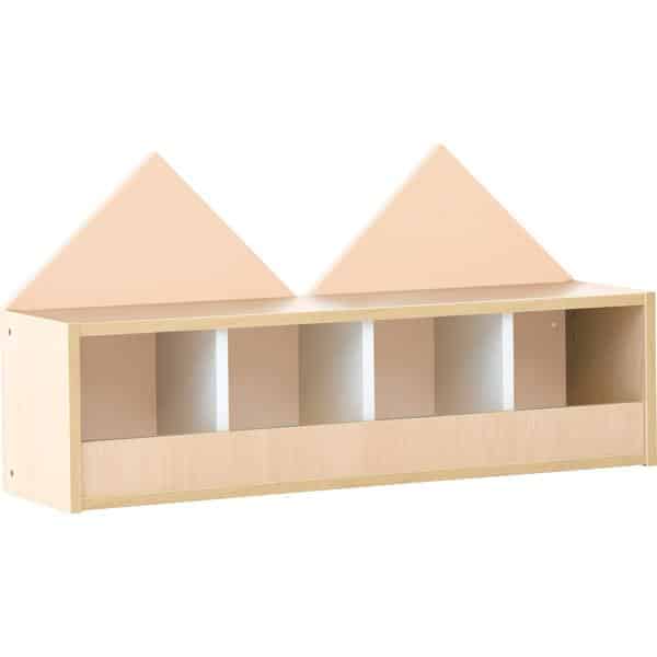Fantasievolles Garderobenregal für 4 Kinder. Aus laminierter Spanplatte (Stärke 18 mm), wahlweise in Ahorn-Dekor oder weiß; Trennwände stets weiß. Die Rückwand des Regals ist als Giebelwand gestaltet und in verschiedenen Farben erhältlich (Material: farbig folierte MDF-Platte, Stärke 18 mm). Farbige Haken (092530-092533, 255100-255102) separat erhältlich.
