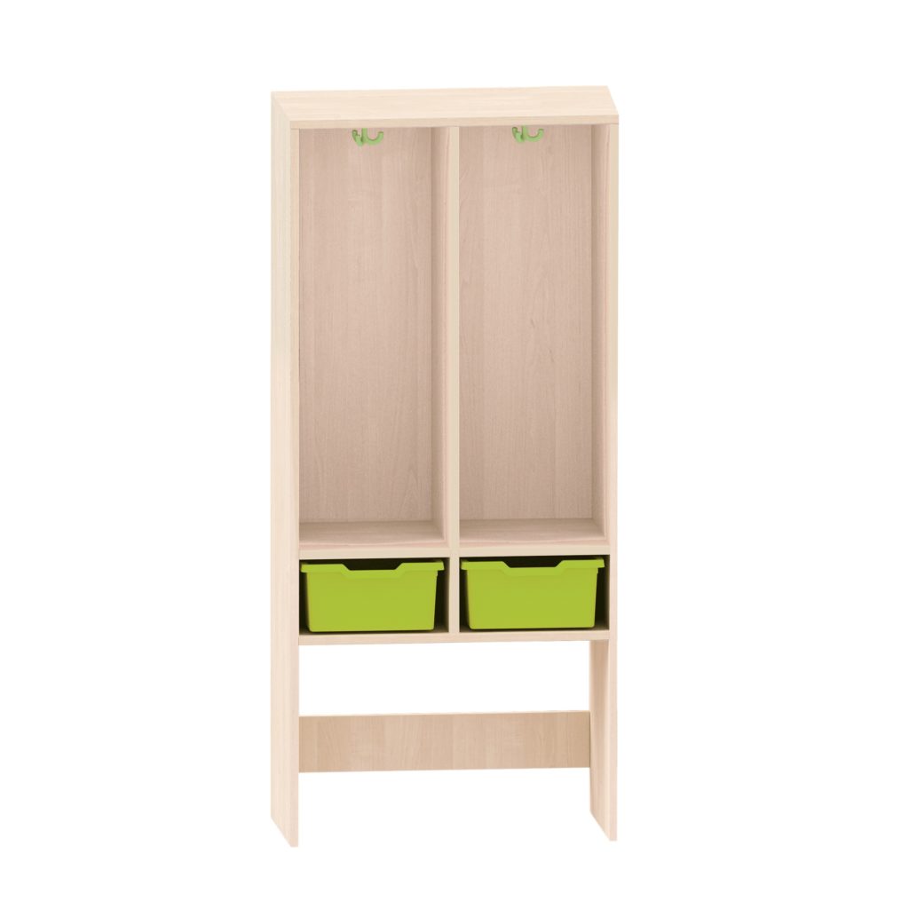 Garderobenregal mit 2 getrennten Fächern oben und 2 ABS-Boxen unten