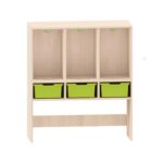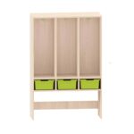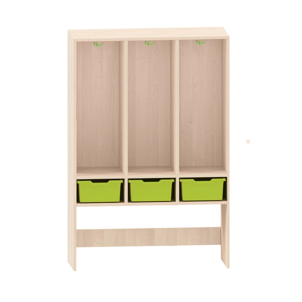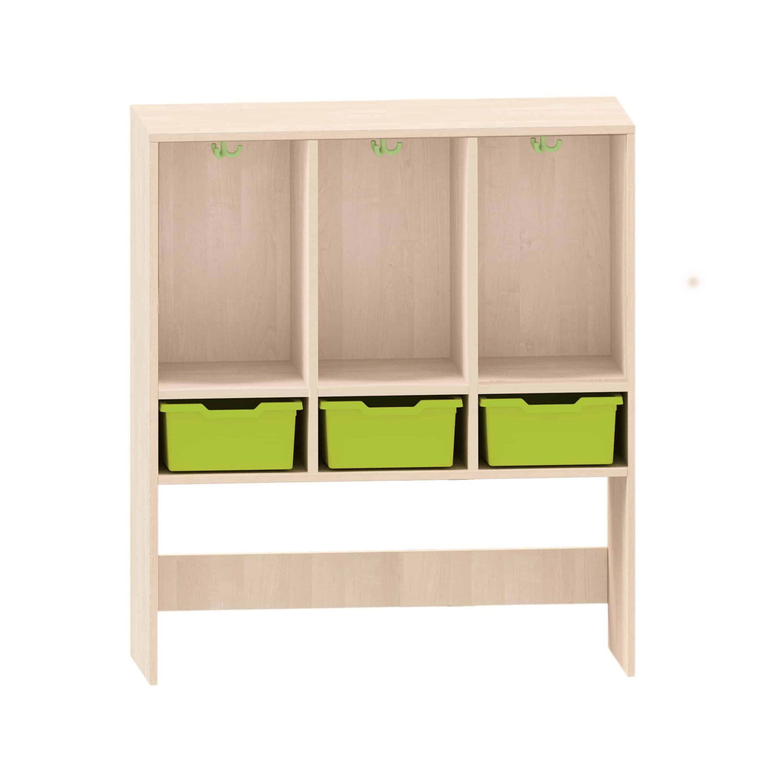Garderobenregal mit 3 getrennten Fächern oben und 3 ABS-Boxen unten