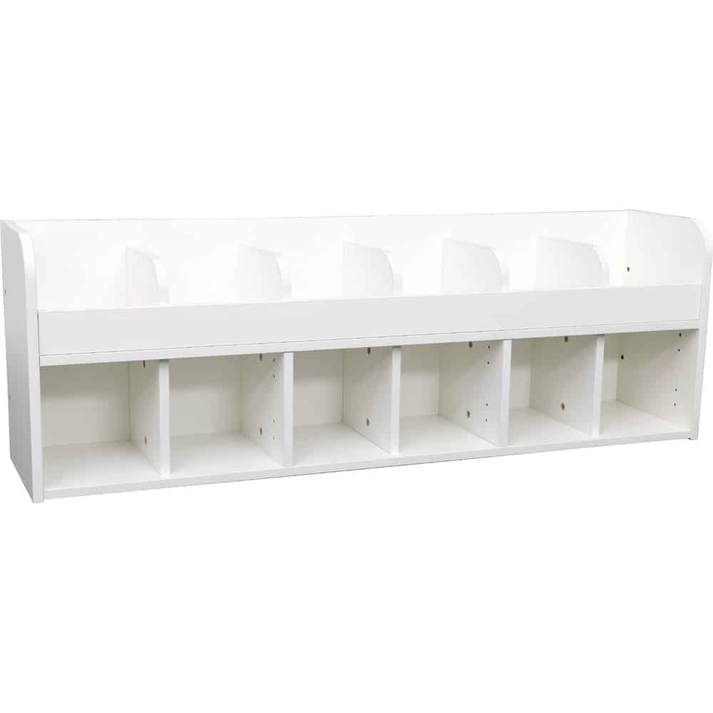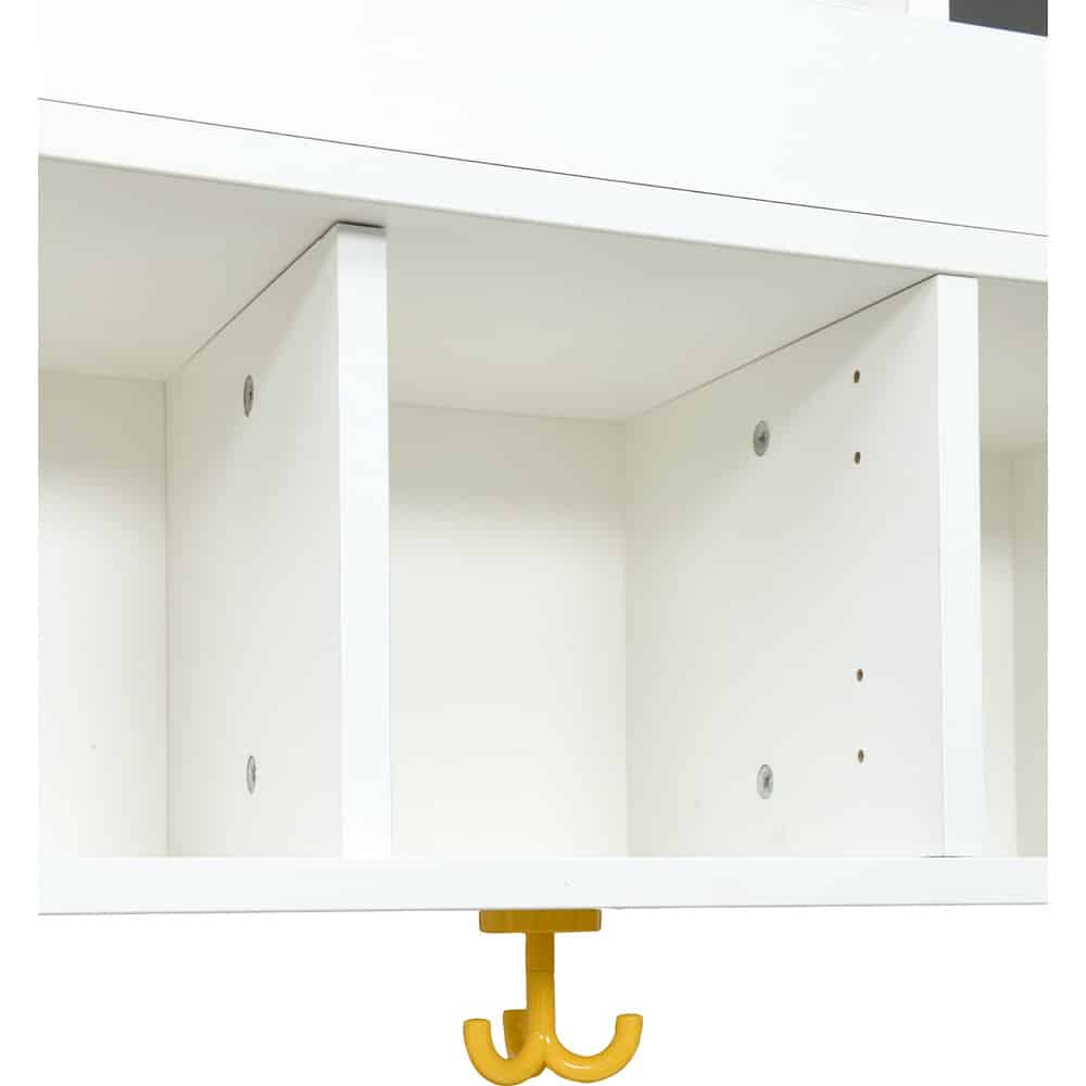 Die Maße der unteren Regalfächer (B 20,5 x T 26 x H 21,5 cm) und der oberen Regalfächer (B 20,5 x T 26 x H 15 cm) bieten genügend Platz für Brotdosen, Wechselkleidung und andere persönliche Gegenstände. Der Mittelteil und die Einlegeböden sind immer weiß gehalten, während der Korpus wahlweise in Weiß oder Ahorn-Dekor erhältlich ist. Ergänzen Sie das Regal mit separat bestellbaren, farbigen Türen und Haken, um dem Raum eine freundliche und einladende Atmosphäre zu verleihen.