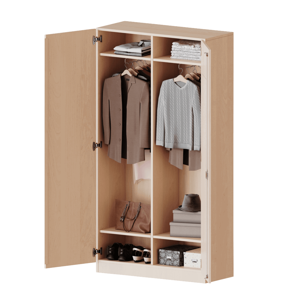 Alle Garderobenschränke sind aus melaminharzbeschichteten E1-Feinspanplatten gefertigt, die FSC-zertifiziert und formaldehydfrei sind. Wir verwenden besonders haltbare 2mm starke ABS-Kanten, die unter hoher Hitze stark verleimt werden. Sie können Ihr Wunschdekor aus unserer Farbauswahl wählen. Die Einlegeböden lassen sich im 32-mm-Raster verstellen und unsere hochwertigen Bodenträger verfügen über einen Auszugsstopp“, der verhindert, dass Böden mit darauf befindlichen Gegenständen aus dem Schrank oder Regal rutschen. Die Türen lassen sich dank Scharnieren um 270° öffnen, sind abschließbar und verfügen über eine Staublippe.