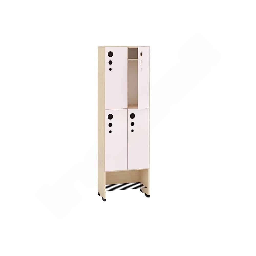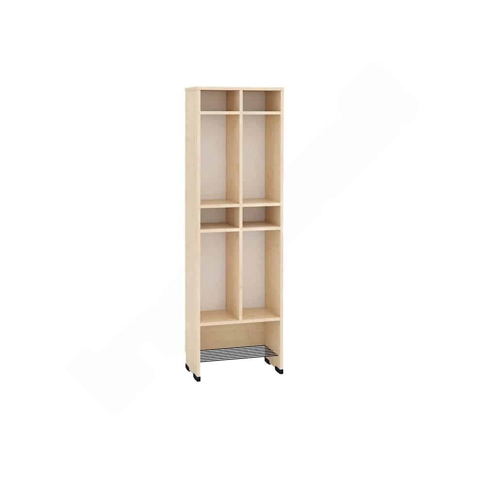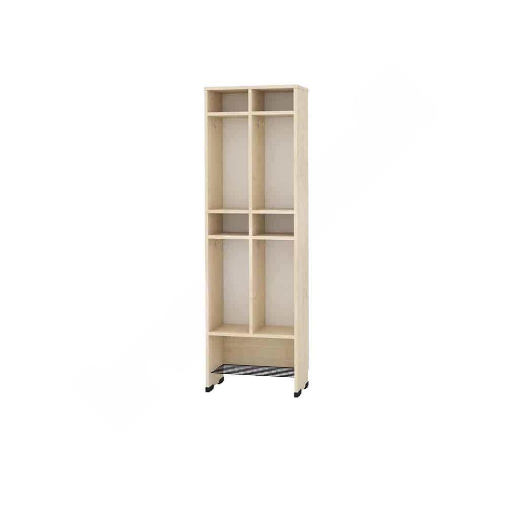 Der Garderobenschrank ist mit mehreren Fächern ausgestattet, die jeweils über einen Doppelhaken für Bekleidung verfügen. Zudem sind Vorbohrungen für zusätzliche Dreifach-Haken vorhanden, die separat bestellt werden können. Ein Gitterrost als Schuhablage sorgt dafür, dass Schuhe hygienisch und ordentlich aufbewahrt werden können. Der Abstand zum Boden beträgt 10 cm, während der Abstand zur oberen Ablage 19 cm beträgt – perfekt für kleinen Händen und große Vorfreude!