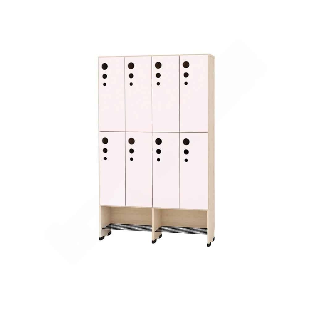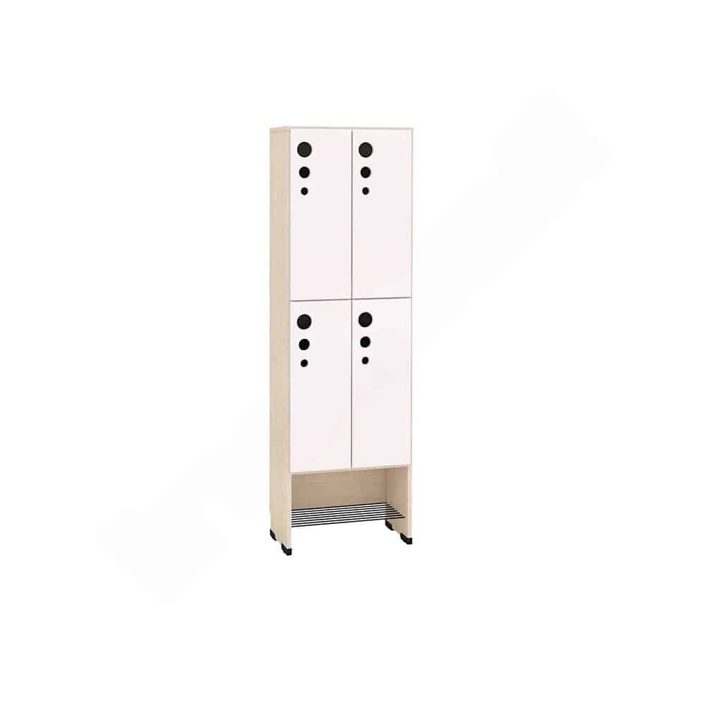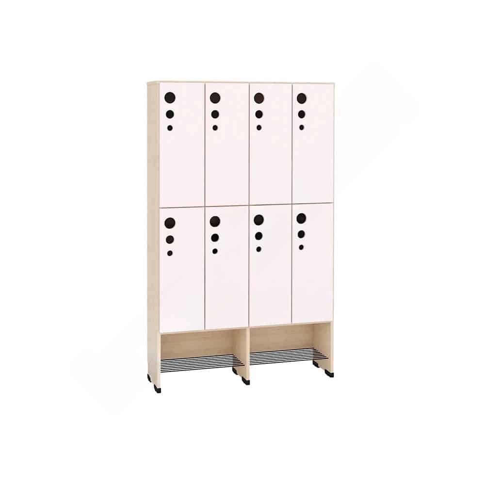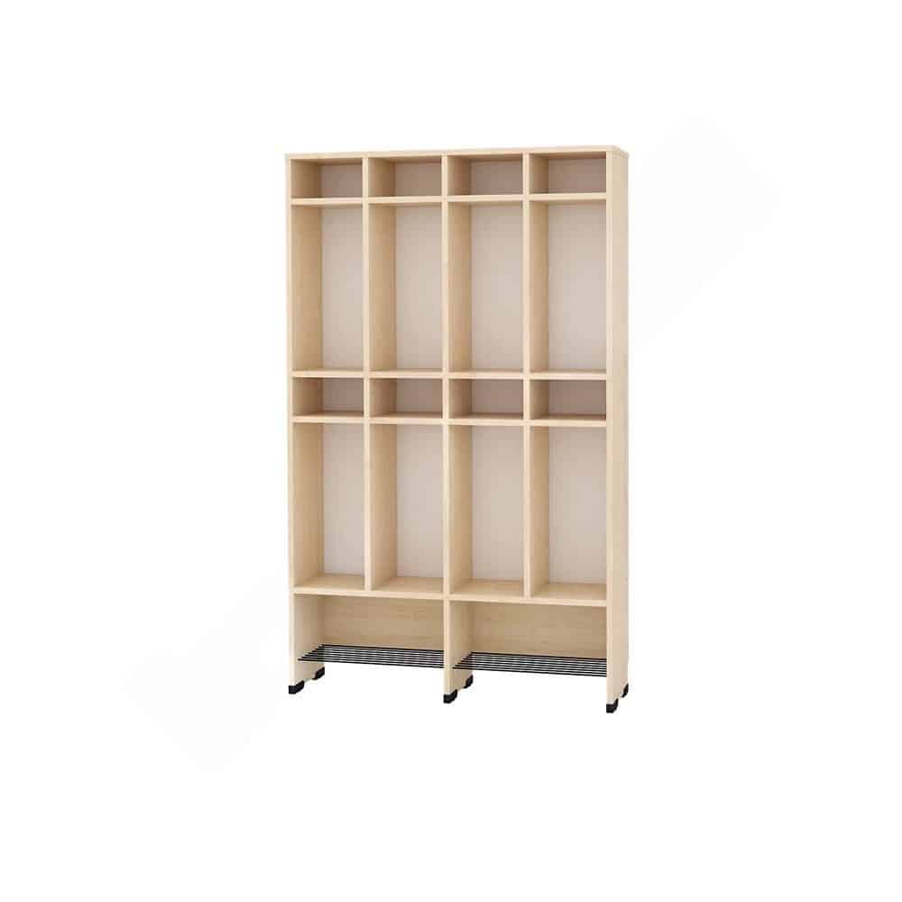 Der Garderobenschrank ist mit mehreren Fächern ausgestattet, die jeweils über einen Doppelhaken für Bekleidung verfügen. Zudem sind Vorbohrungen für zusätzliche Dreifach-Haken vorhanden, die separat bestellt werden können. Ein Gitterrost als Schuhablage sorgt dafür, dass Schuhe hygienisch und ordentlich aufbewahrt werden können. Der Abstand zum Boden beträgt 10 cm, während der Abstand zur oberen Ablage 19 cm beträgt – perfekt für kleinen Händen und große Vorfreude!