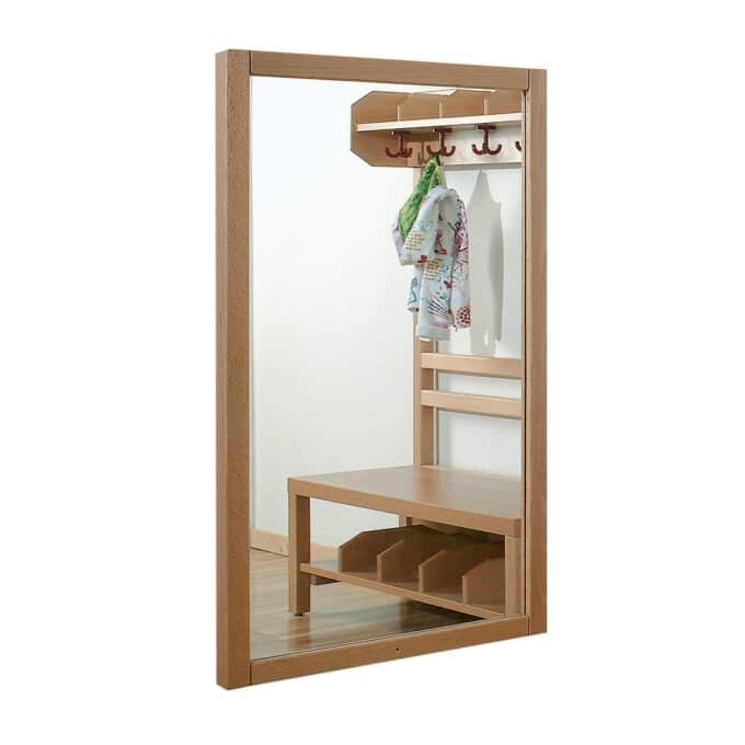 Entdecken Sie einen Spiegel, der Eleganz, Stabilität und kompromisslose Sicherheit vereint. Unser Garderobenspiegel mit massivem Buchenholzrahmen ist weit mehr als nur eine reflektierende Fläche – er ist ein pädagogisch wertvolles Element, das Kinder in ihrer Selbstwahrnehmung stärkt und jedem Raum eine warme, einladende Atmosphäre verleiht. Ob im Garderobenbereich, im Gruppenraum oder in der Bewegungsecke, dieser Spiegel wurde speziell für die hohen Anforderungen in Krippe, Kindergarten und Schule entwickelt. Dank seiner splitterfreien Konstruktion und der stabilen, verdeckten Wandbefestigung bietet er höchste Sicherheit, selbst wenn es im Alltag einmal turbulenter zugeht.