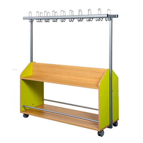- Beidseitig nutzbar: Der Garderobenwagen ist ein echtes Stauraumwunder. Durch die beidseitige Bestückung mit Haken und die zwei durchgehenden Ablageböden bietet er enorm viel Platz für Jacken, Ranzen, Helme und Schuhe – ideal für ganze Gruppen.