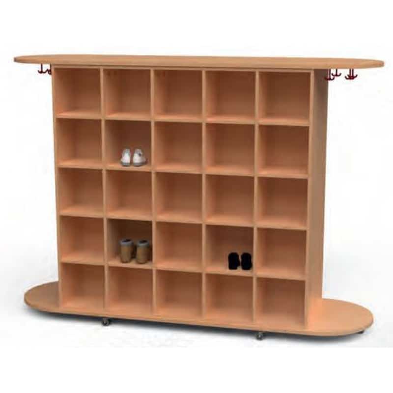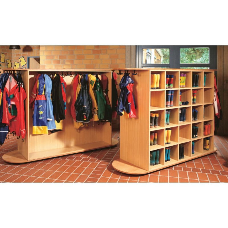Gefertigt aus hochwertigem Material mit einem ansprechenden Dekor in Buche, fügt sich der Garderobenwagen harmonisch in jede pädagogische Einrichtung ein. Die robusten Schuhfächer bieten Platz für unterschiedlichste Schuhe, während die Dreifachhaken zusätzlichen Platz für Jacken, Rucksäcke und Accessoires bieten.