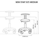 Die Sitzhöhe ist in mehreren Varianten von 30 cm – 48 cm und 66 cm mit Gleiter erhältlich. New Star wird mit 3 verschiedenen Radtypen angeboten: herkömmliche Rollen, Rollen mit weichem Profil, mit Lastabhängige bremsenrädern und Gleiter.