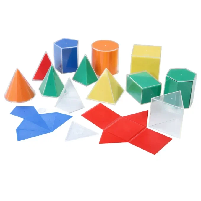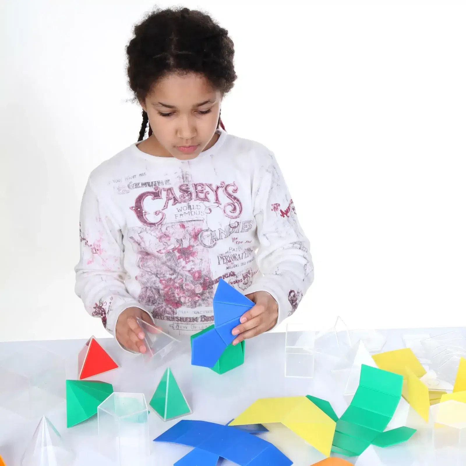 Das Set besteht aus elf verschiedenen geometrischen Formen, die jeweils als transparenter Körper und als herausnehmbares Faltnetz vorhanden sind. Kinder können die Netze falten, sie in die transparenten Hüllen stecken und so direkt erleben, wie aus einer flachen Form ein räumliches Objekt entsteht. Ob im Kindergarten zur ersten spielerischen Annäherung an Formen oder im Mathematikunterricht der Grund- und weiterführenden Schulen zur Veranschaulichung komplexer geometrischer Zusammenhänge – dieses Set macht Mathematik lebendig. Die großen, handlichen Formen und die klare farbliche Zuordnung erleichtern das Verständnis und fördern das räumliche Vorstellungsvermögen auf intuitive Weise.