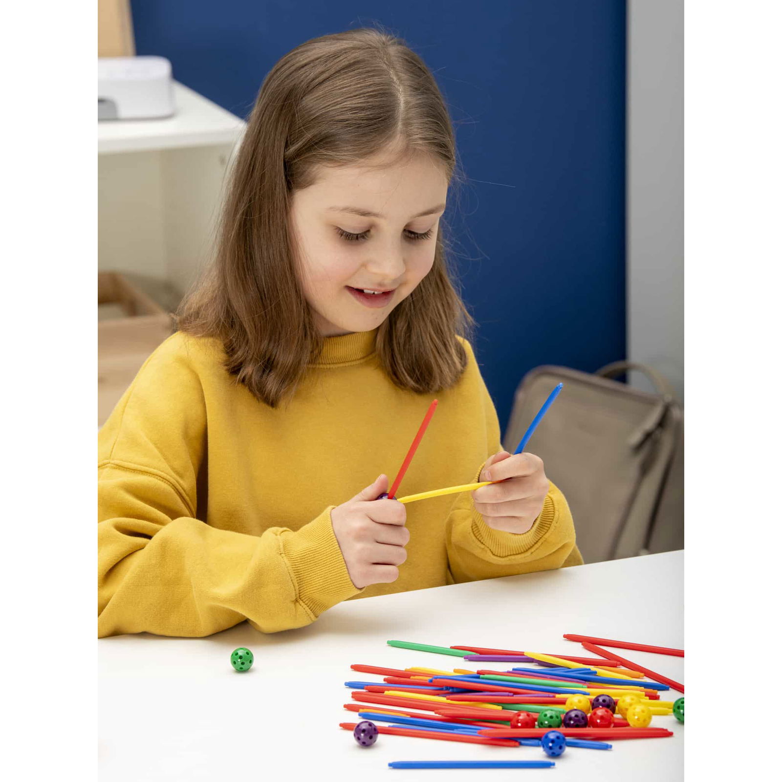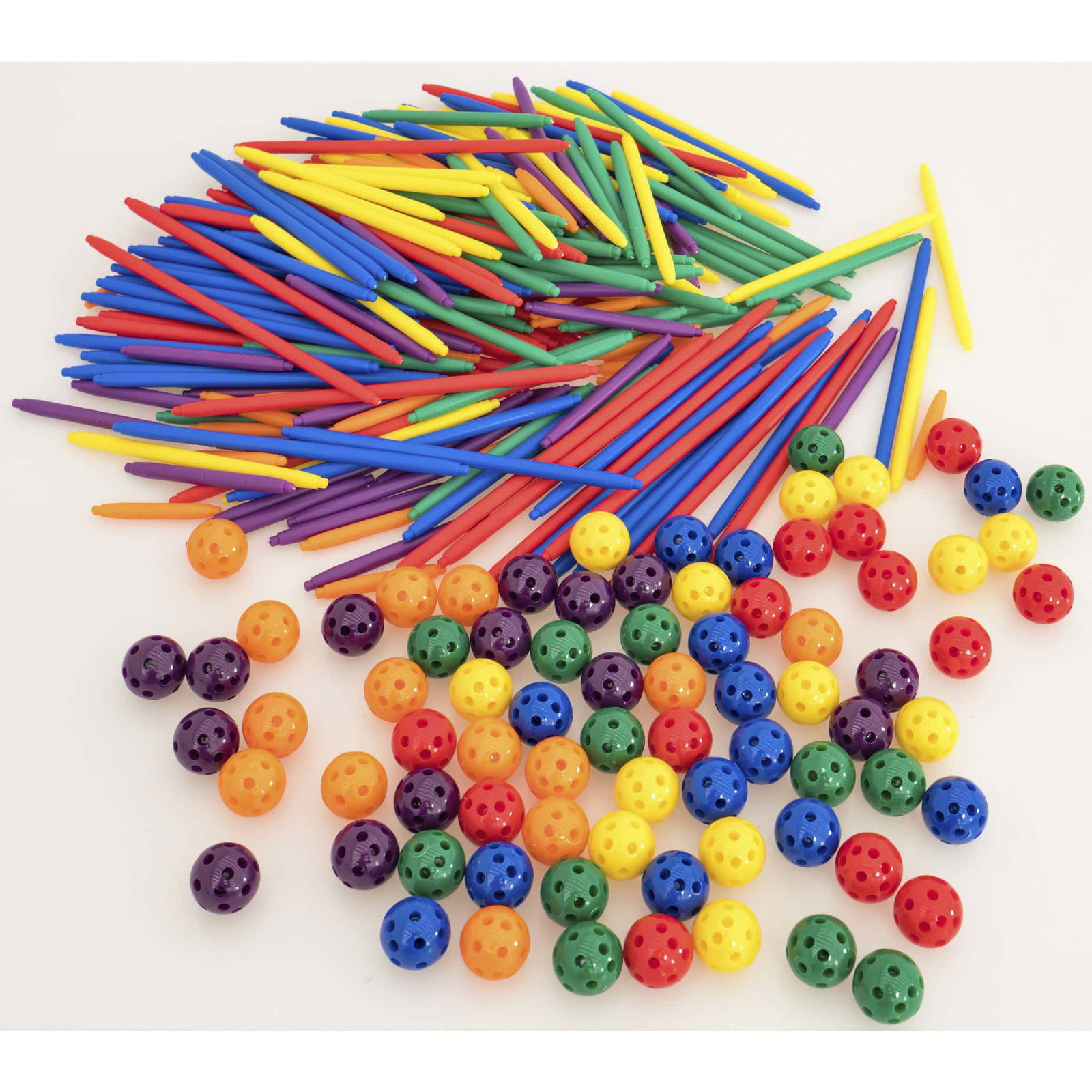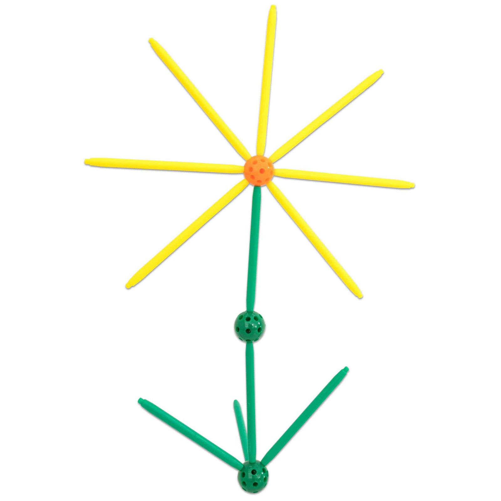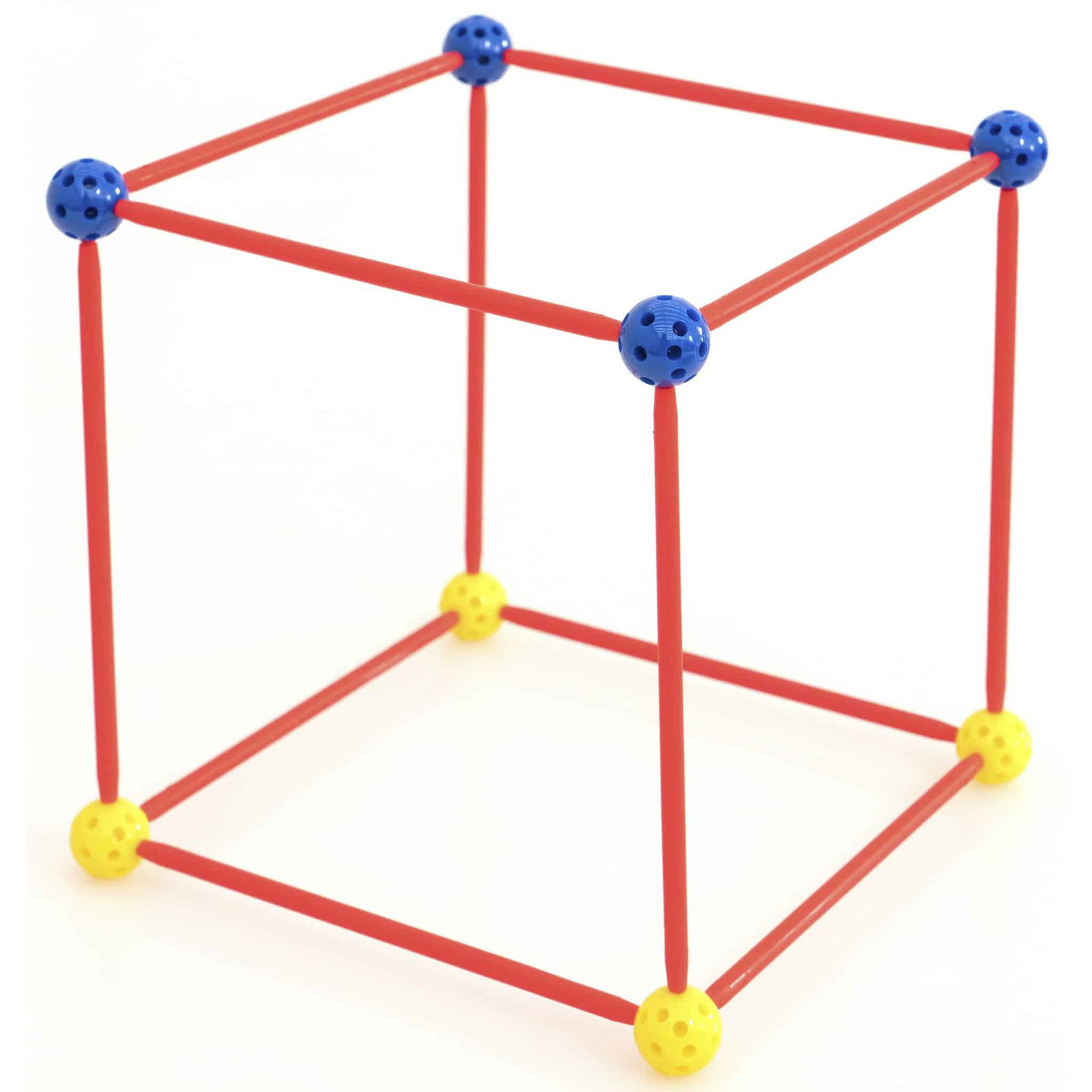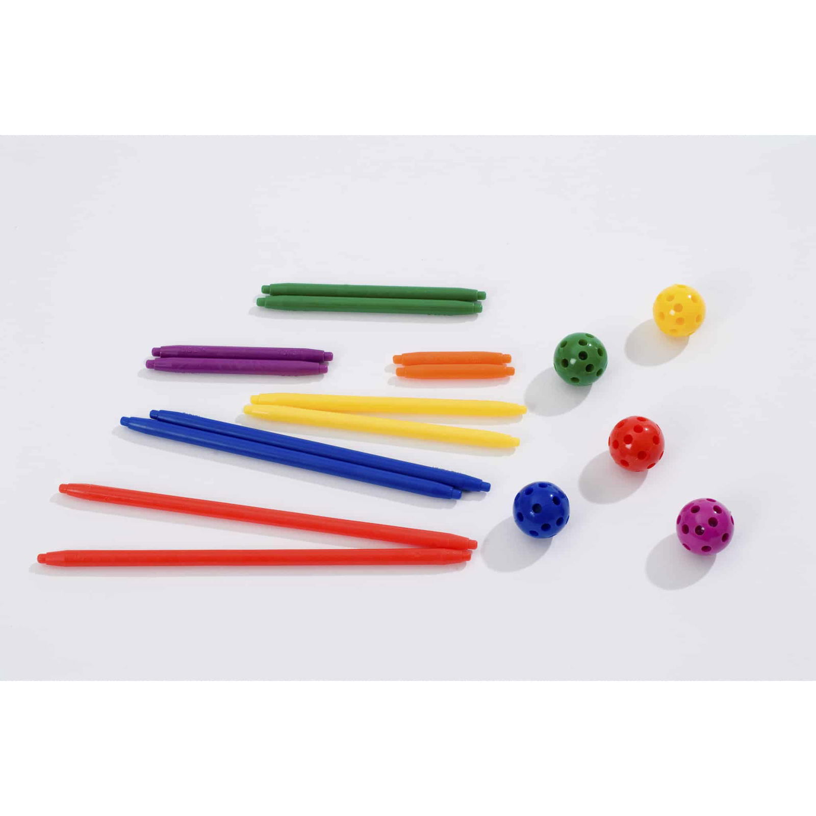 Der Bausatz beinhaltet 6 verschiedene Stangenlängen, wobei jede Länge eine eigene Farbe hat. Diese Farbzuordnung erleichtert den Kindern das Erkennen und Benennen der einzelnen Teile. Die Stangen dienen als Steckverbindungen zwischen den Kugeln und werden an den fertigen Körpern als Kanten oder Diagonalen sowie an den Flächen als Seitenlinien wahrgenommen. Hier sind die Details:
