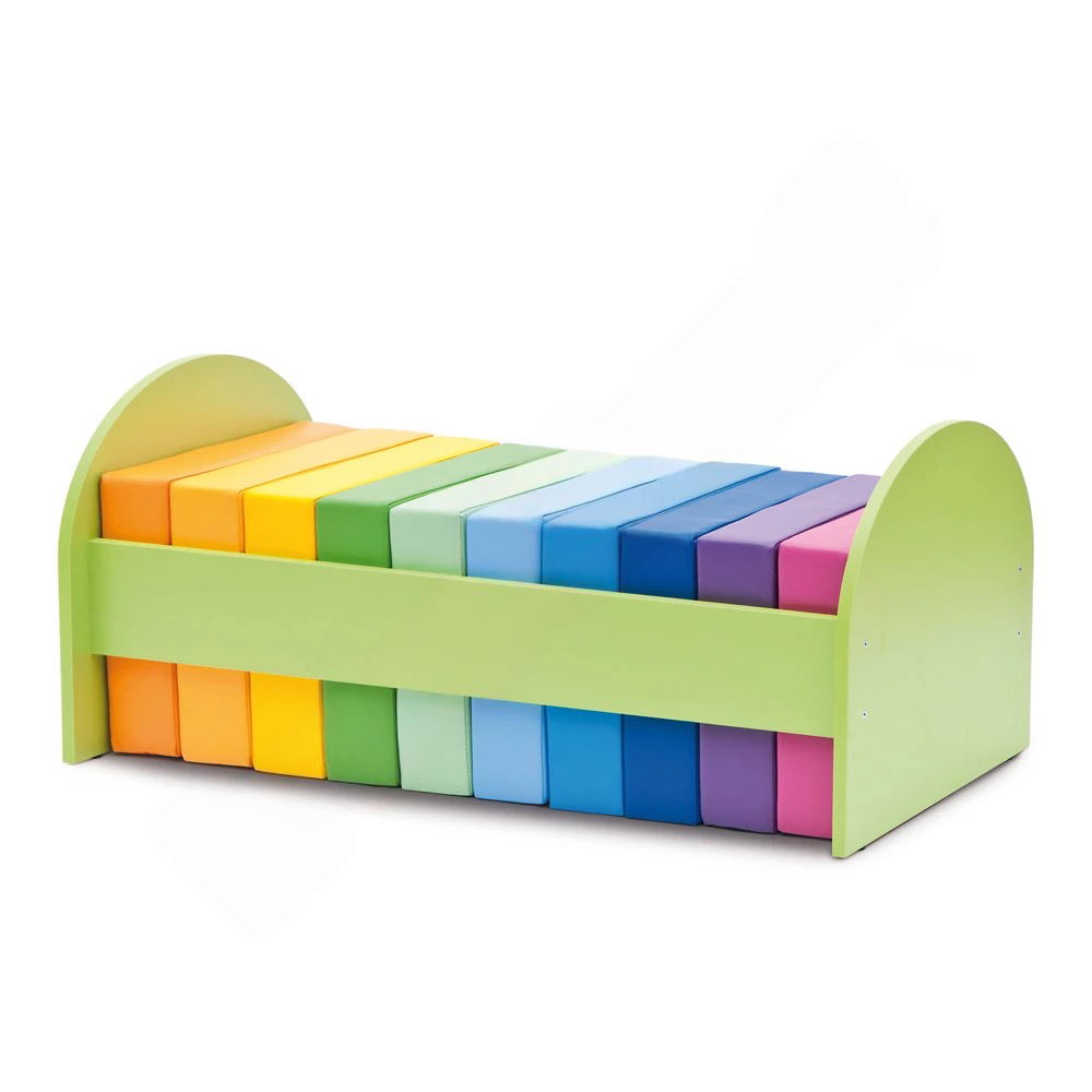 Die kräftigen Regenbogenfarben der Kissen bringen gute Laune in jeden Raum und können pädagogisch genutzt werden, zum Beispiel zum Farbenlernen oder zum Bilden von Gruppen. Das freundliche Grün des Gestells ergänzt das farbenfrohe Bild und schafft einen harmonischen Gesamteindruck.