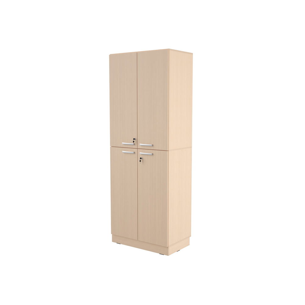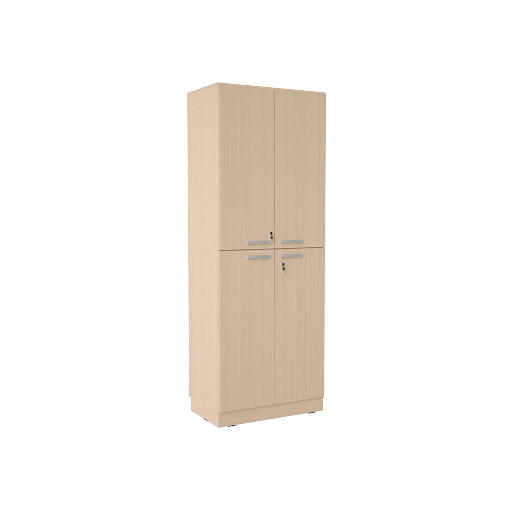 Dieses Modell ist eine perfekt aufeinander abgestimmte Kombination aus zwei großen Schrankelementen (Größe L), die zusammen eine imposante und doch elegante Einheit bilden. Das Ergebnis ist ein komplett geschlossener, viertüriger Schrank, der Ruhe und eine klare Struktur in jeden Raum bringt. Hinter den Türen verbergen sich fünf robuste Fachböden, die den Innenraum flexibel gliedern. Doch dieser Schrank ist nicht nur groß, er ist auch sicher und komfortabel: Alle vier Türen sind abschließbar und mit einer hochwertigen Soft-Close-Funktion ausgestattet. Verfügbar in der warmen Holzoptik „Ahorn Jylland“ oder in einem klaren, modernen „Weiß“, ist er eine stilvolle und zugleich langlebige Ergänzung für jedes professionelle Umfeld.