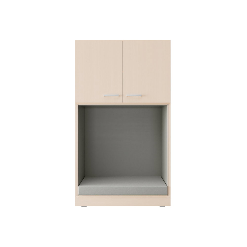Das Besondere an diesem Hochschrank ist die durchdachte Konstruktion. Sie haben die Wahl zwischen einem klassischen, durchgehenden Aufbewahrungsschrank oder einer Variante mit integrierter Sitznische. Diese Nische dient als gemütlicher Rückzugsort zum Lesen oder Ausruhen. Sie ist mit einem leicht überstehenden, grau laminierten HPL-Sperrholz verkleidet, das nicht nur modern aussieht, sondern auch extrem widerstandsfähig ist. Eine weiche, zehn Zentimeter dicke Matte mit einem pflegeleichten Kunstlederbezug sorgt für den nötigen Komfort. So schaffen Sie eine kleine Oase der Ruhe direkt in Ihrem Aufbewahrungssystem.