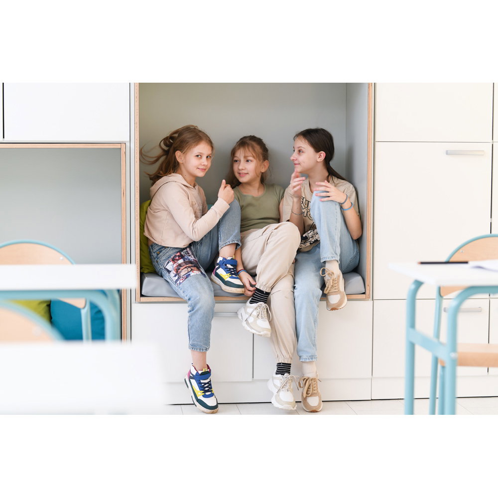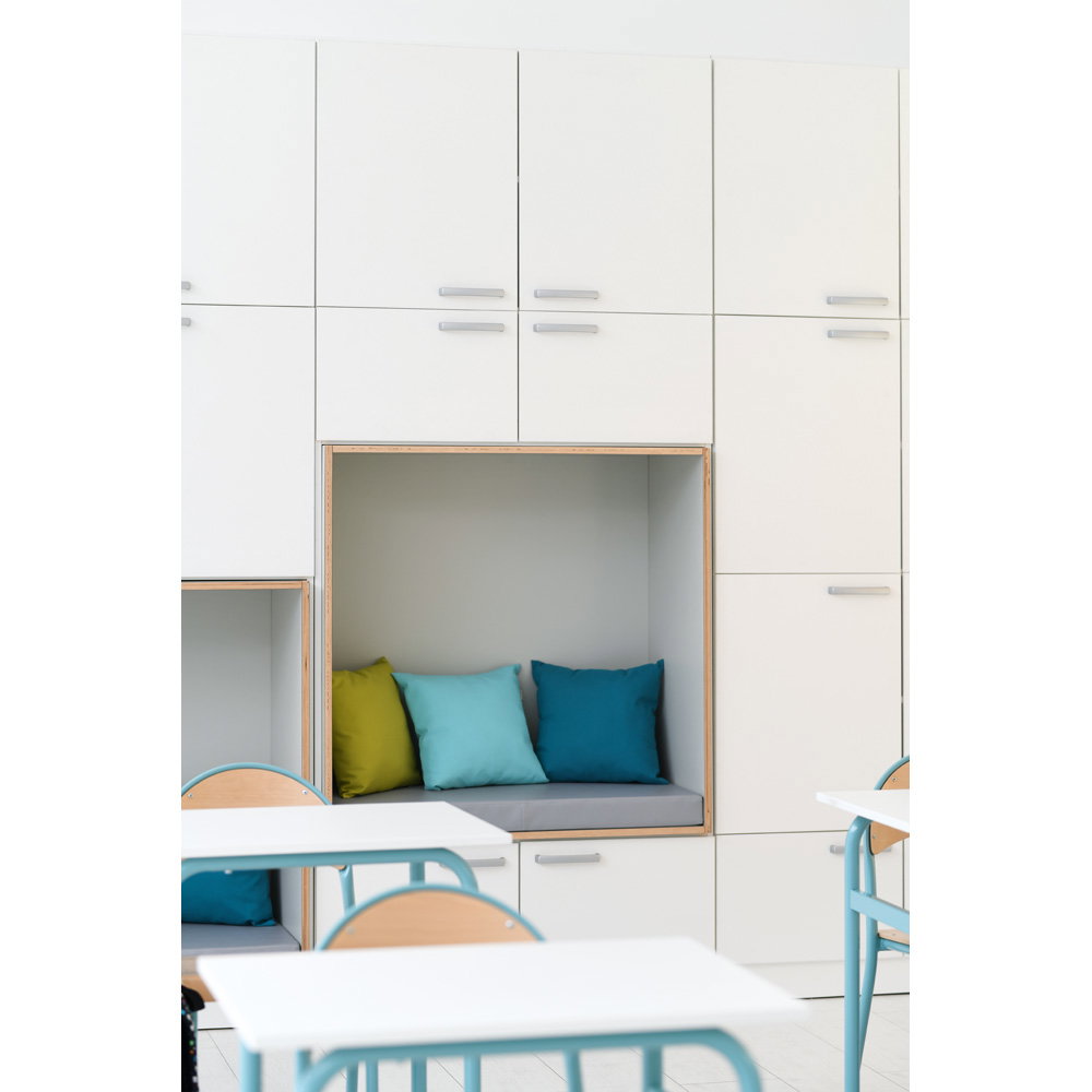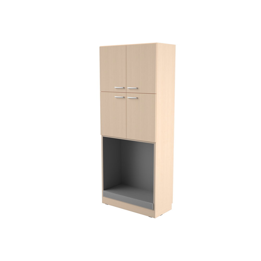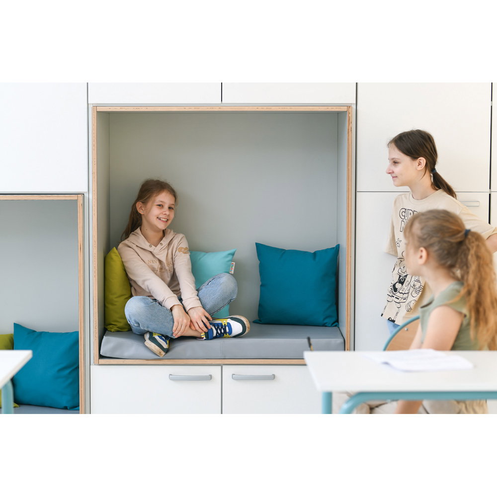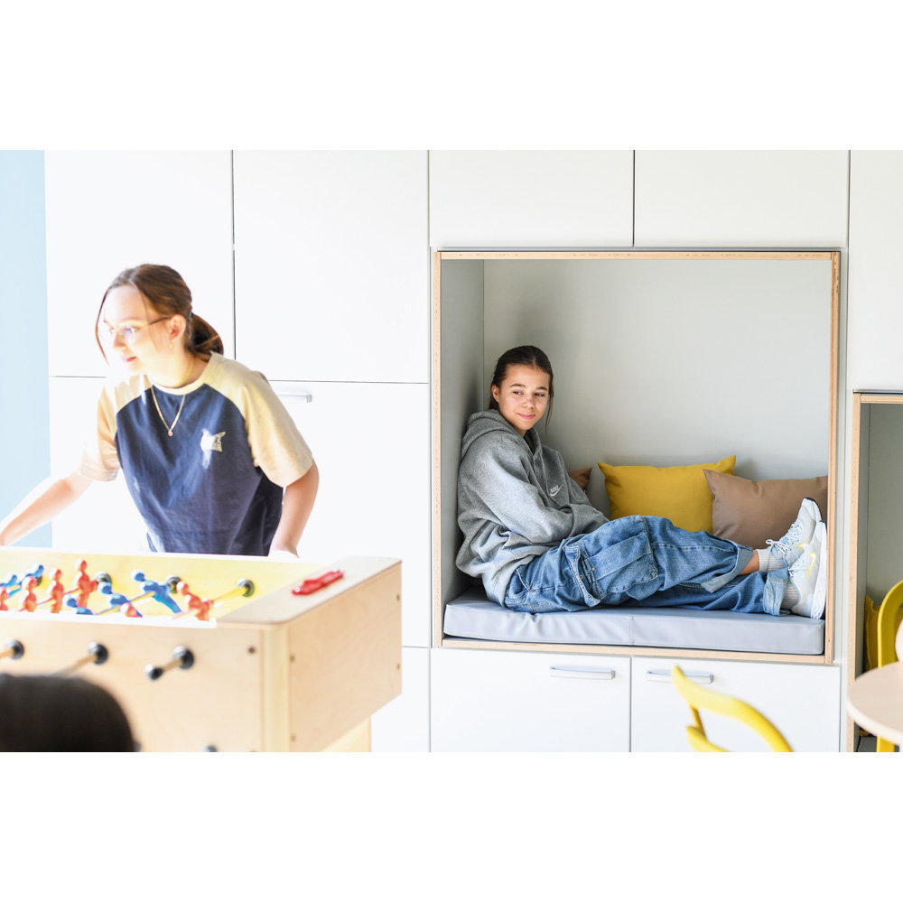 Hohe Räume bieten ein enormes Potenzial für Stauraum – ein Potenzial, das mit intelligenten Möbellösungen optimal genutzt werden will. Der Grande Hochschrank XXL wurde exakt für diesen Zweck konzipiert. Mit seiner beeindruckenden Höhe von fast 2,60 Metern verwandelt er ungenutzte Wandflächen in ein perfekt organisiertes Aufbewahrungssystem. Gleichzeitig kann er weit mehr sein als nur ein Schrank: Optional ausgestattet mit einer gemütlichen Sitznische, verbindet er maximale Funktionalität mit einem einladenden Ort der Ruhe. Ob in der Kita-Lobby, im Aufenthaltsraum der Schule oder in einer modernen Bürolandschaft – dieses Möbelstück ist ein Statement für Struktur, Komfort und intelligentes Design.