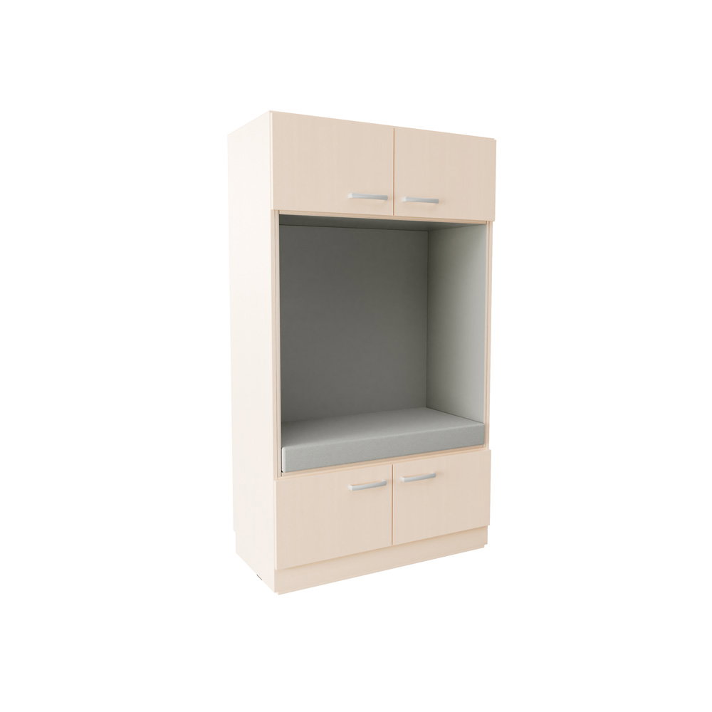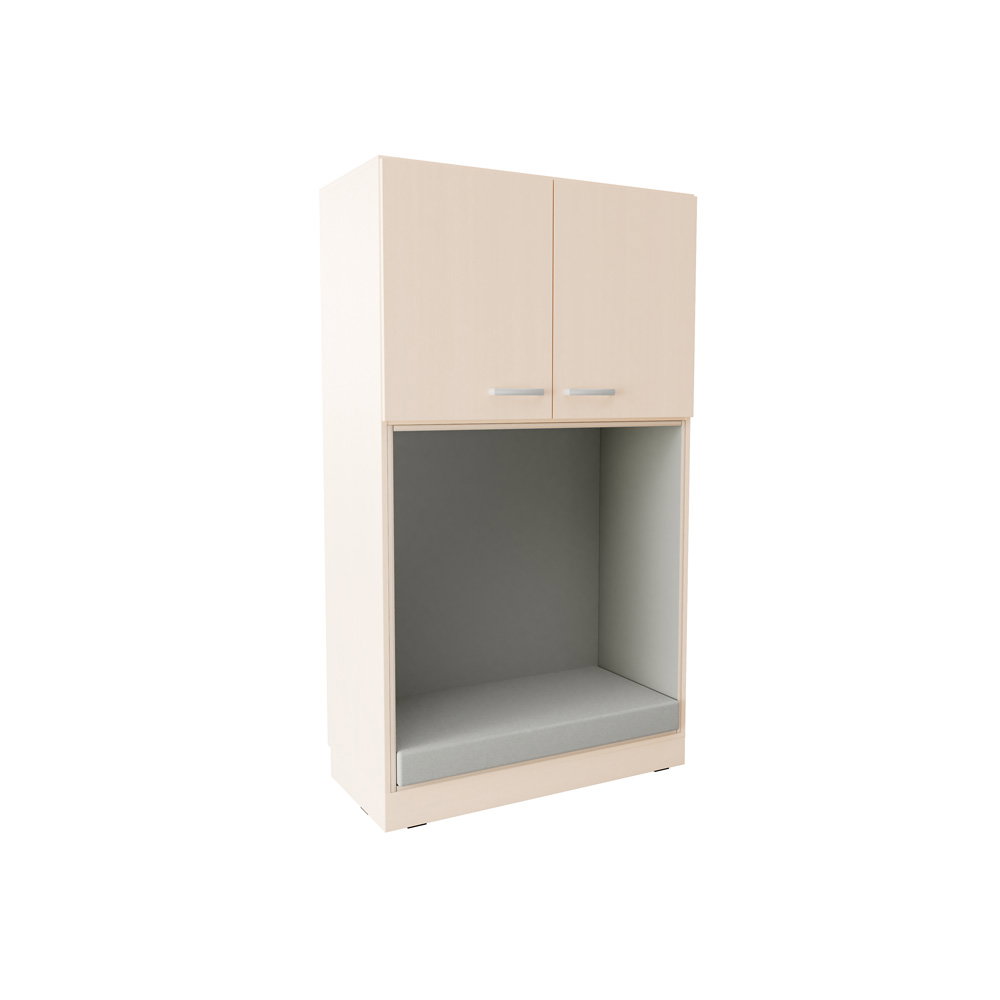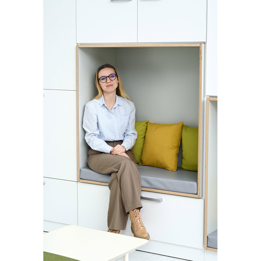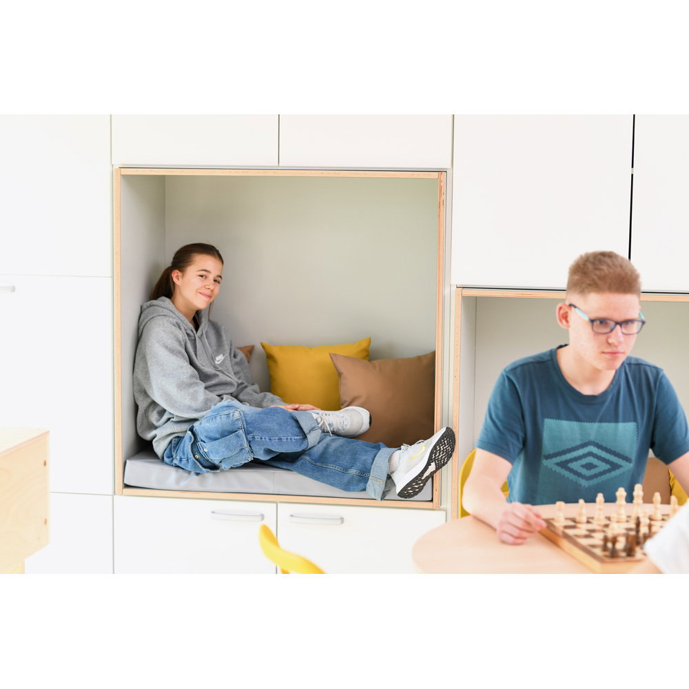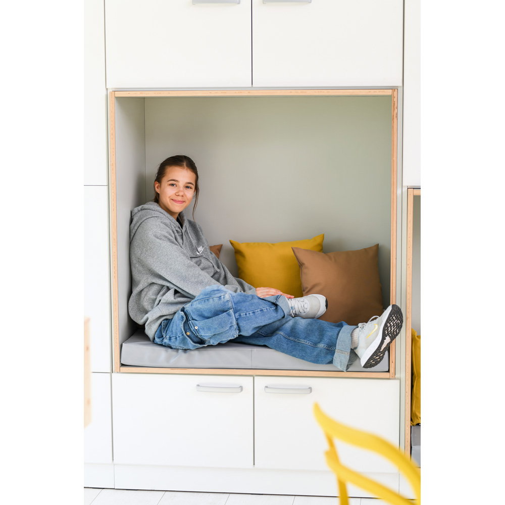 Das Herzstück des Grande Hochschranks XXL ist seine optionale, integrierte Sitznische. Dieser großzügige Bereich wird zu einem geschützten Rückzugsort, ideal zum Lesen, für eine kurze Pause oder für ein ruhiges Gespräch. Die Nische ist mit extrem widerstandsfähigem, grauem HPL-laminiertem Sperrholz verkleidet, das den Bereich vor Abnutzung schützt und einen modernen Akzent setzt. Für höchsten Komfort sorgt die dicke, bequeme Matte mit einem pflegeleichten Kunstlederbezug. So wird der Schrank von einem reinen Funktionsmöbel zu einem multifunktionalen Lieblingsplatz, der die Raumqualität spürbar verbessert.