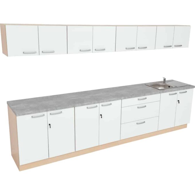 Die Schränke sind aus laminierter Spanplatte (Stärke 18 mm) in Ahorn-Dekor mit weißen Fronten gefertigt. Die robusten Schubladen mit Metallführung und Soft-Close-Mechanismus sind leichtgängig und schließen gedämpft. Türen sind mit leise schließenden 90°-Scharnieren mit Anschlagdämpfer ausgestattet. Die Arbeitsplatte ist mit HPL beschichtet – hygienisch und wasserfest. Die Arbeitshöhe beträgt 86 cm.