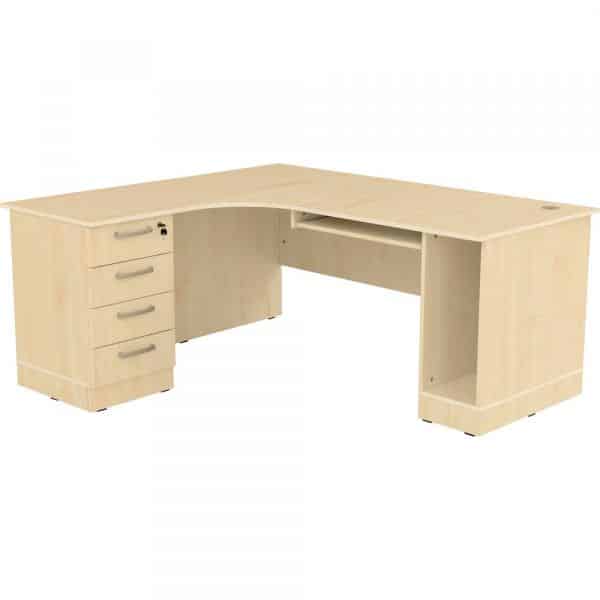 L-Schreibtisch aus laminierter Spanplatte (Stärke: 18 mm) in Ahorn-Optik oder weiß, mit 4 Schubladen, Blickschutz von allen Seiten. Mit Kabeldurchführung und Platz für einen PC-Tower sowie einem Tastaturauszug. Die oberste Schublade ist abschließbar.