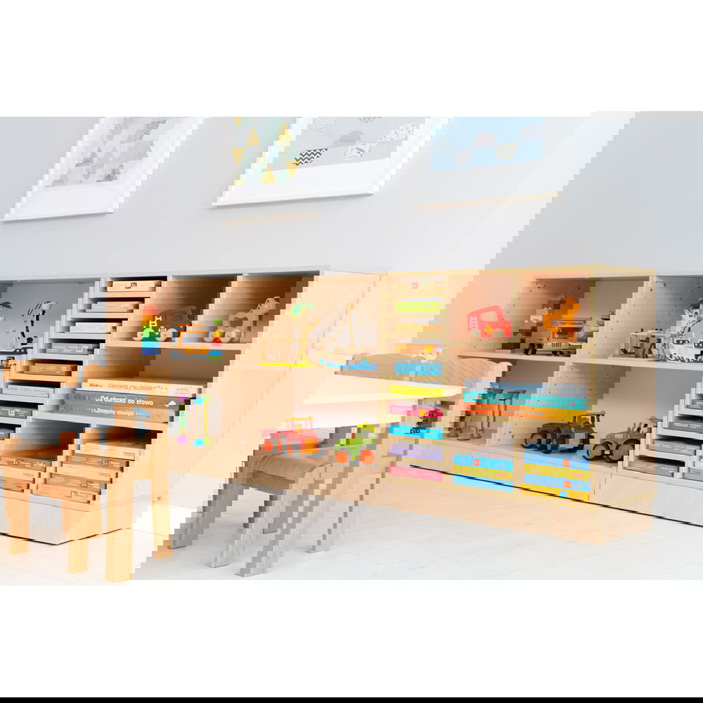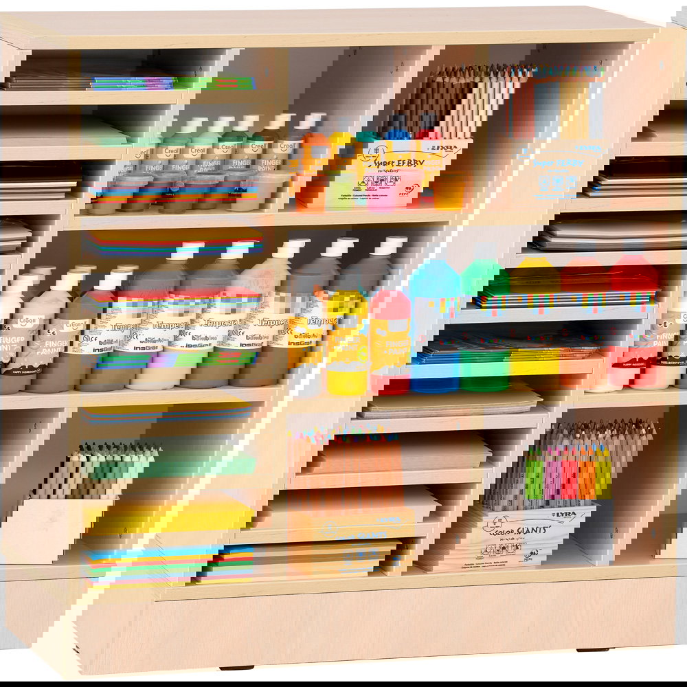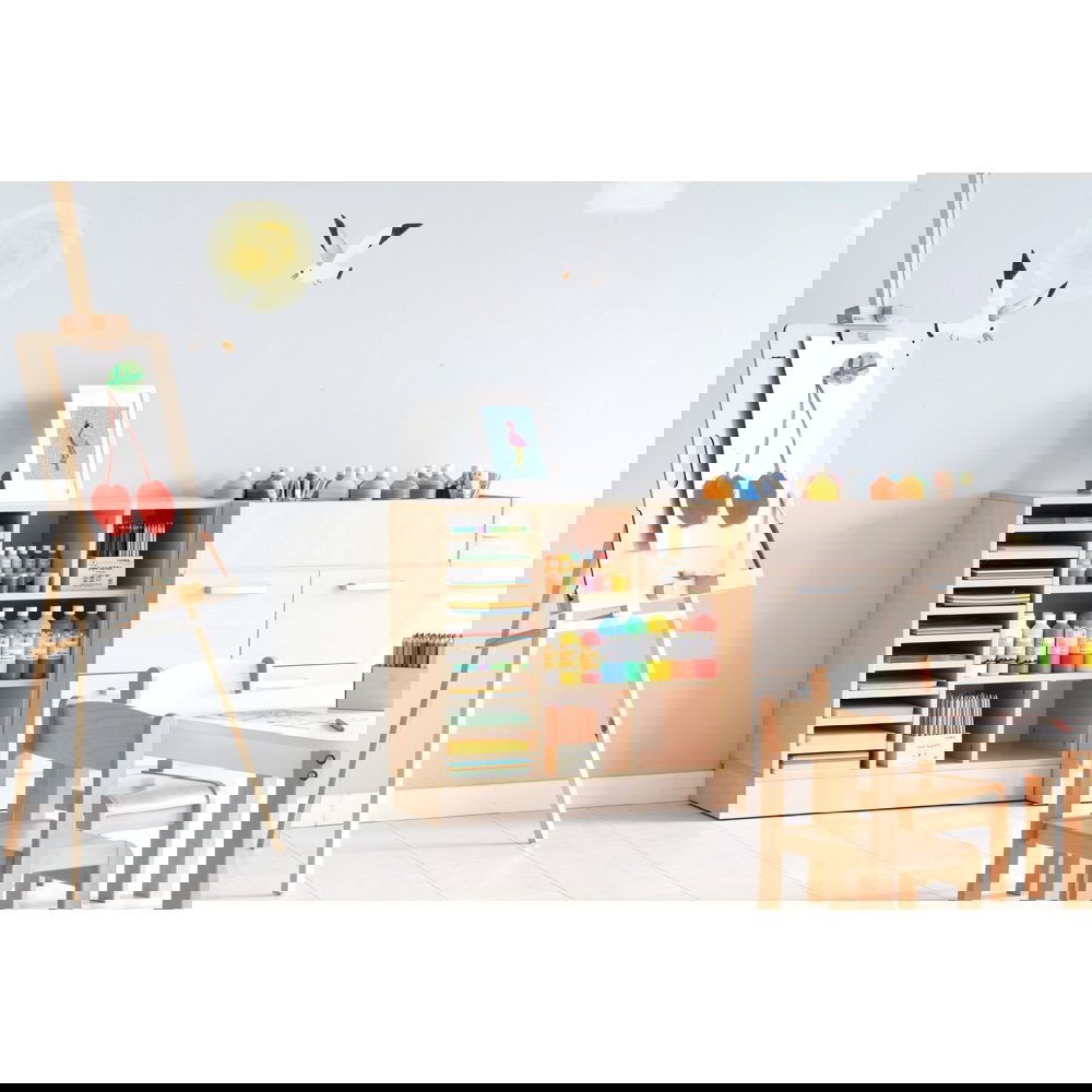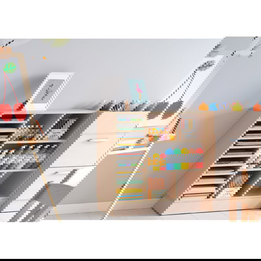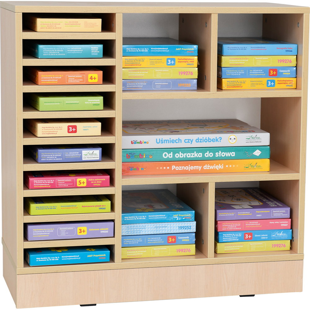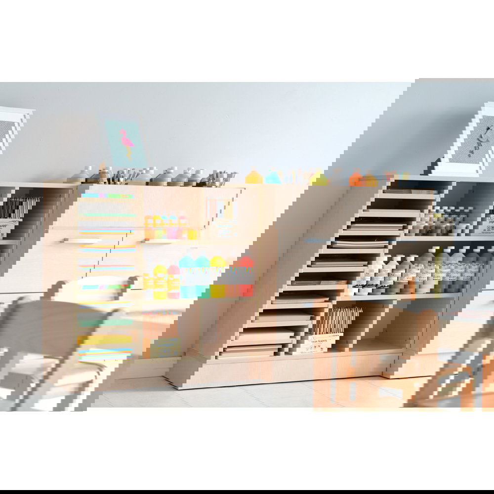 Das Besondere an diesem Möbelstück ist seine asymmetrische Fächeraufteilung, die den verfügbaren Stauraum maximal effizient nutzt. Auf der linken Seite bieten flache Fächer (Höhe ca. 5 cm) die ideale Lösung für alles, was liegend gelagert werden muss – seien es Tonpapier, laminierte Arbeitsblätter oder Puzzles. Auf der rechten Seite hingegen finden in den höheren Fächern (Höhe ca. 21 cm) voluminösere Gegenstände wie Spielekartons, Bücherstapel oder Aufbewahrungsboxen ihren Platz. Gefertigt aus robuster, 18 mm starker laminierter Spanplatte, ist dieser Schrank extrem widerstandsfähig und pflegeleicht. Ob in warmer Ahorn-Optik oder neutralem Weiß: Er bringt Struktur in Ihre Materialsammlung und sorgt dafür, dass alles seinen festen Platz hat und sofort griffbereit ist.