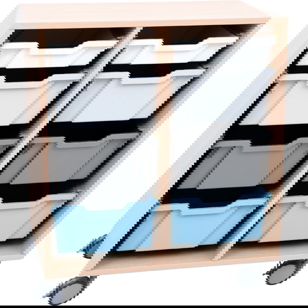 Dieses Regalsystem ist konsequent auf Mobilität und maximale Anpassungsfähigkeit ausgelegt. Dank der vier robusten Rollen, von denen zwei feststellbar sind, lässt es sich mühelos durch den Raum bewegen und sicher positionieren. Stellen Sie sich vor, Sie bereiten eine Kreativstunde vor: Statt unzählige Materialien zu tragen, rollen Sie einfach den gesamten, perfekt bestückten Wagen an den Tisch. Die beiden Fächer des Regals bieten Platz für Ihre individuelle Auswahl an separat erhältlichen Kunststoffbehältern. Jedes Fach kann bis zu sieben flache Behälter aufnehmen, sodass Sie eine beeindruckende Feinorganisation für Dokumente, Stifte und Kleinteile realisieren können. Gestalten Sie ein System, das sich Ihrem Alltag anpasst, nicht umgekehrt.