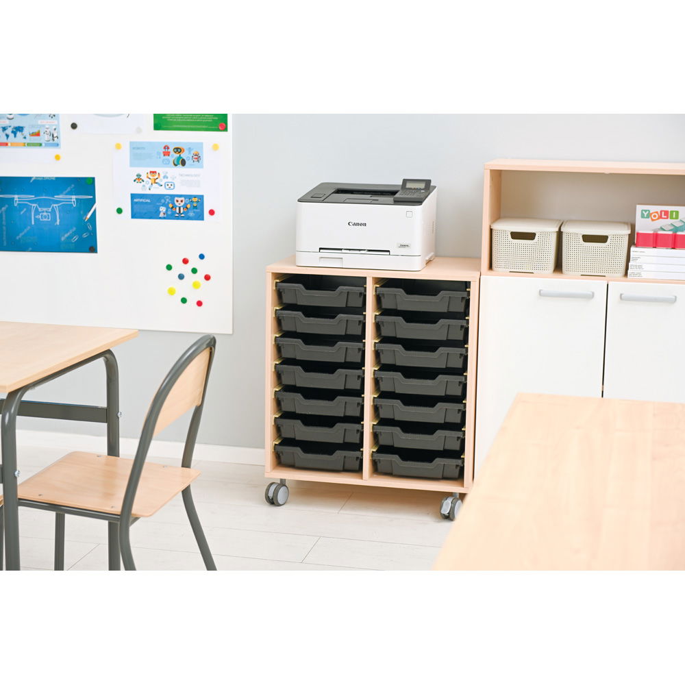Gefertigt aus einer 18 mm starken, laminierten Spanplatte und ausgestattet mit stabilen Rollen, ist dieses Regal für den dauerhaften und intensiven Gebrauch in Schulen, Kitas und Büros bestens gerüstet.