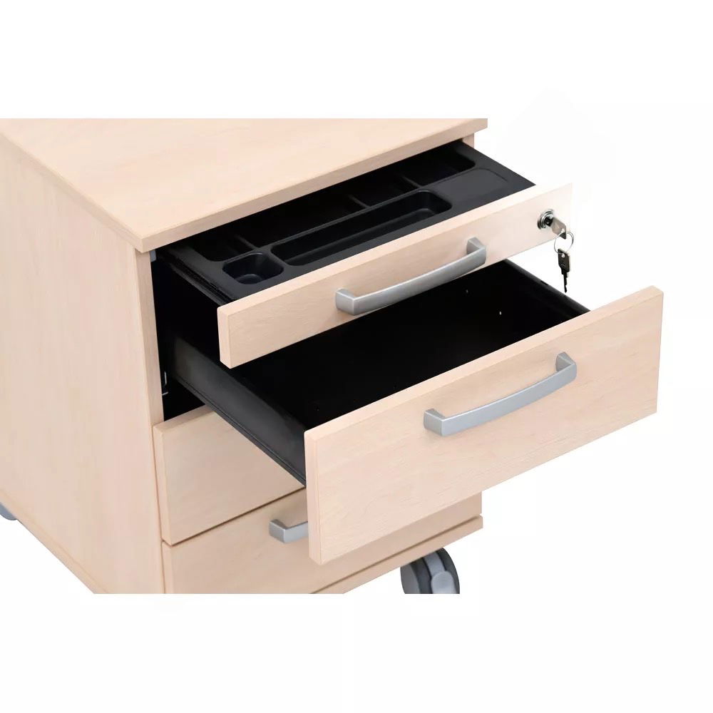 Vertraulichkeit ist wichtig. Anders als bei einfachen Containern, bei denen oft nur eine Schublade abschließbar ist, verfügt der Grande Rollcontainer über eine Zentralverriegelung. Mit nur einer Drehung des Schlüssels sichern Sie alle vier Schubladen gleichzeitig vor unbefugtem Zugriff. So sind sensible Akten und persönliche Gegenstände jederzeit geschützt. - Durchdachte Aufteilung für perfekte Ordnung