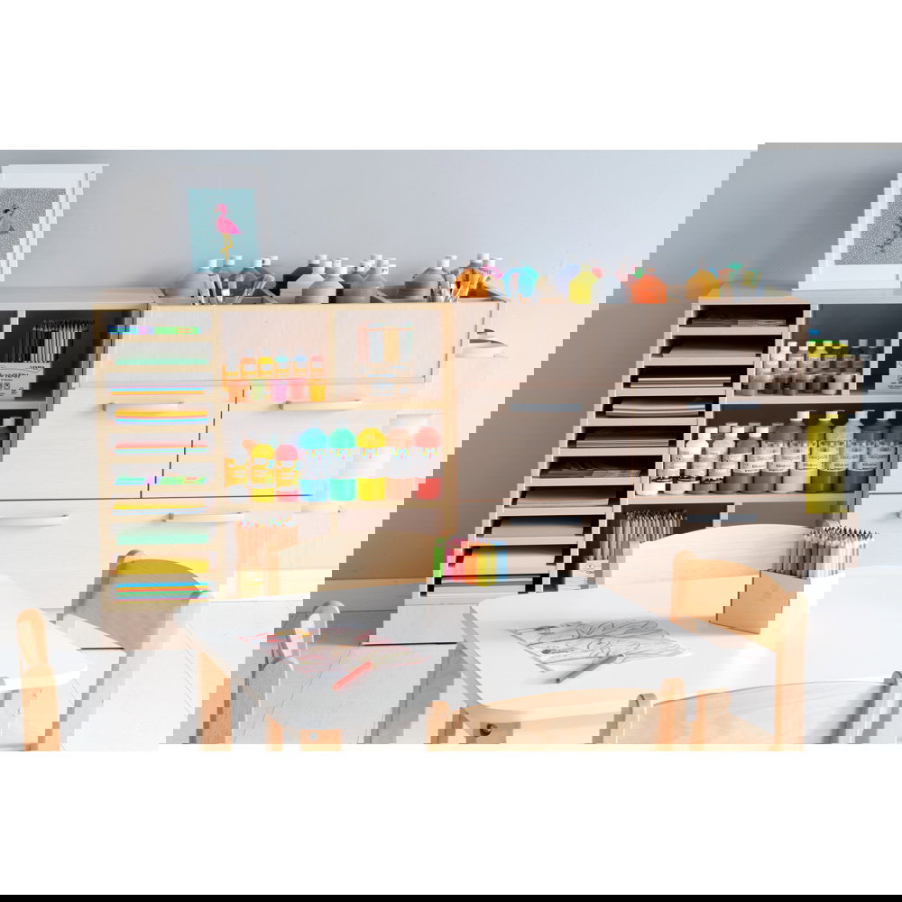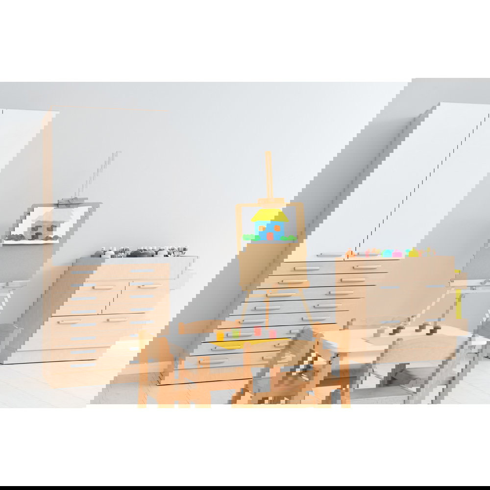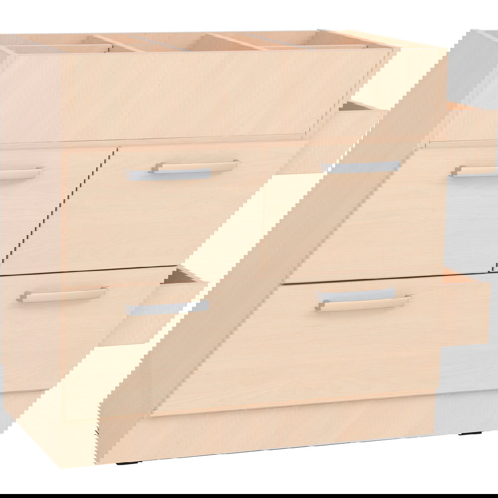 Anders als herkömmliche Schränke, die oft nur über Einlegeböden verfügen, bietet dieser Universalschrank eine durchdachte Mischung aus geschlossenen Schubladen und offenen Fächern. Eine breite Schublade unten und zwei schmalere Schubladen darüber bieten Platz für flache Gegenstände, Kleinteile oder Notenhefte. Die offenen Fächer eignen sich hervorragend für höhere Gegenstände, die schnell zur Hand sein müssen. Der eigentliche Clou befindet sich jedoch an der Seite: Ein cleveres Anbaumodul bietet unten ein schmales Fach und oben einen stabilen Rahmen – die perfekte Lösung, um lange Papierrollen, Poster oder Pläne sicher und knickfrei aufrecht zu lagern. Gefertigt aus robuster, 18 mm starker laminierter Spanplatte, hält dieser Schrank dem lebhaften Alltag in Schulen und Kindergärten problemlos stand.
