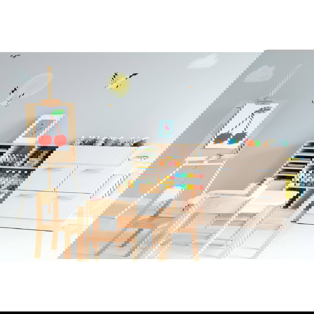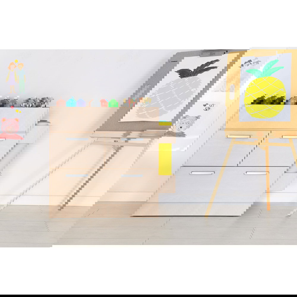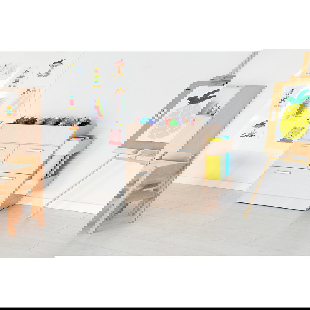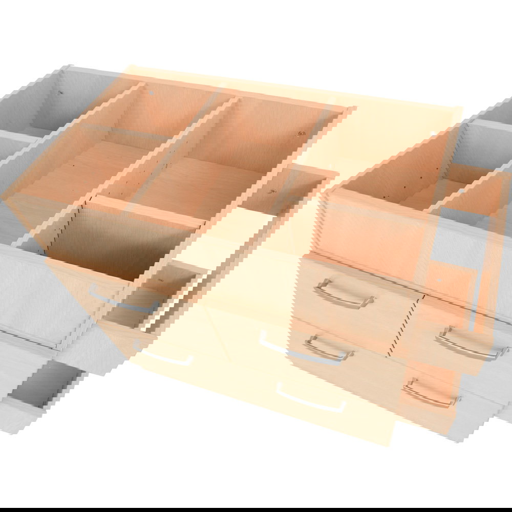 Anders als herkömmliche Schränke, die oft nur über Einlegeböden verfügen, bietet dieser Universalschrank eine durchdachte Mischung aus geschlossenen Schubladen und offenen Fächern. Eine breite Schublade unten und zwei schmalere Schubladen darüber bieten Platz für flache Gegenstände, Kleinteile oder Notenhefte. Die offenen Fächer eignen sich hervorragend für höhere Gegenstände, die schnell zur Hand sein müssen. Der eigentliche Clou befindet sich jedoch an der Seite: Ein cleveres Anbaumodul bietet unten ein schmales Fach und oben einen stabilen Rahmen – die perfekte Lösung, um lange Papierrollen, Poster oder Pläne sicher und knickfrei aufrecht zu lagern. Gefertigt aus robuster, 18 mm starker laminierter Spanplatte, hält dieser Schrank dem lebhaften Alltag in Schulen und Kindergärten problemlos stand.
