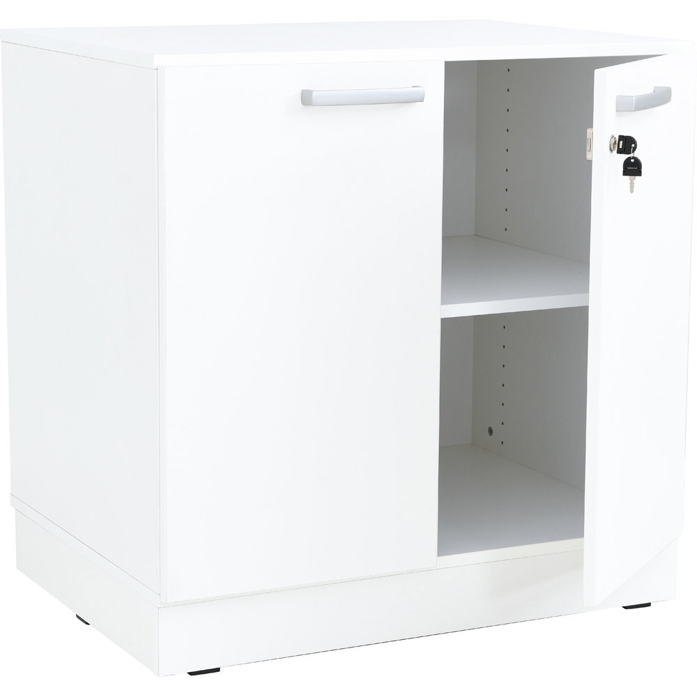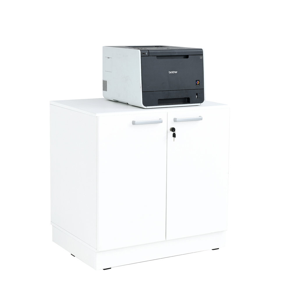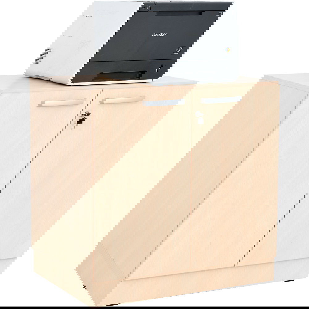 Mit einer Tiefe von über 60 cm ist dieser Unterschrank die perfekte, stabile Basis für schwere und große Bürogeräte. Die robuste Konstruktion sorgt für einen wackelfreien Stand und schützt Ihre wertvolle Technik. - Abschließbarer Stauraum für Zubehör