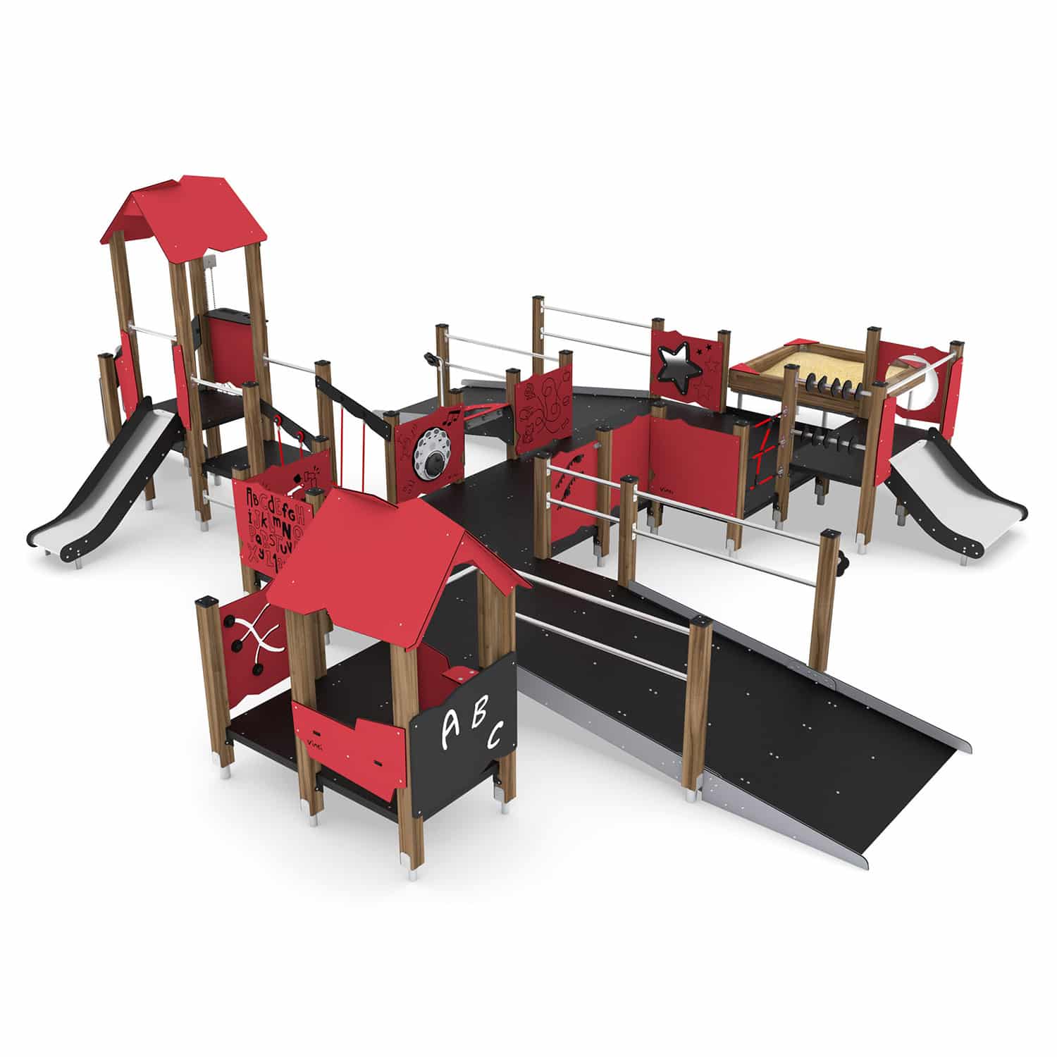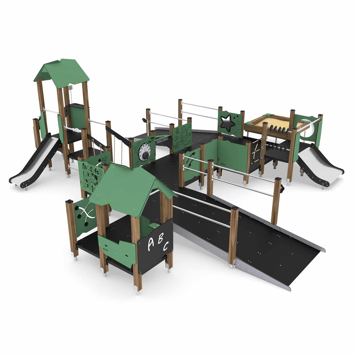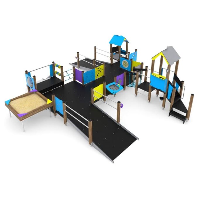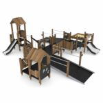 Materialangabe Große Behindertengeeignete Spielanlage mit 2 Rampen, 2 Spieltürmen und Sandkasten WOODEN WD1506 von Vinci Play