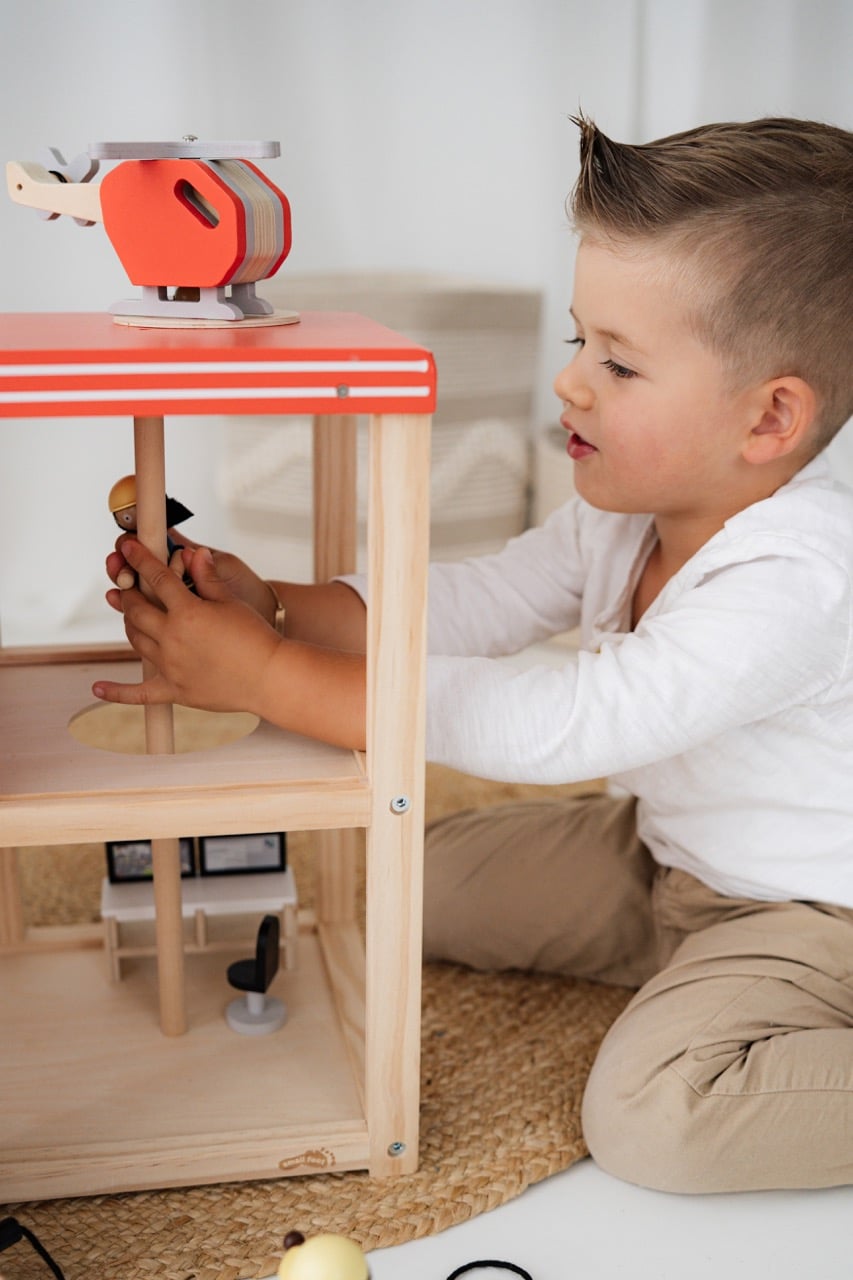 Alarm in der Spielzeugstadt! Ein lautes Läuten der Glocke hallt durch die Gänge, Blaulicht zuckt auf und Sirenengeräusche erfüllen den Raum. Es ist Zeit für einen Einsatz! Mit der großen, voll ausgestatteten Feuerwache aus Holz von small foot werden Kinderträume wahr und das Kinderzimmer verwandelt sich in das pulsierende Zentrum heldenhafter Rettungsmissionen. Dieses detailreiche Spielset bietet auf mehreren Ebenen alles, was kleine Feuerwehrleute für ihre fantasievollen Abenteuer benötigen: von einer Kommandozentrale und einem Aufenthaltsraum über eine Werkstatt mit Rampe bis hin zum Hubschrauberlandeplatz auf dem Dach. Komplett mit Feuerwehrauto, Helikopter, Biegepuppen und einem XXL-Zubehörpaket ist diese Feuerwache der perfekte Ort, um Mut, Teamgeist und unzählige Geschichten zu entfachen.