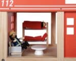 - Interaktive Funktionen entdecken: Die Wache steckt voller spielbarer Details. In der Werkstatt können die Fahrzeuge über eine Rampe einfahren und die elastischen Gummiband-Türen simulieren ein echtes Rolltor. Oben auf dem Dach wartet der Landeplatz auf den Helikopter und eine klassische Alarmglocke kann manuell geläutet werden, um alle zum Einsatz zu rufen.