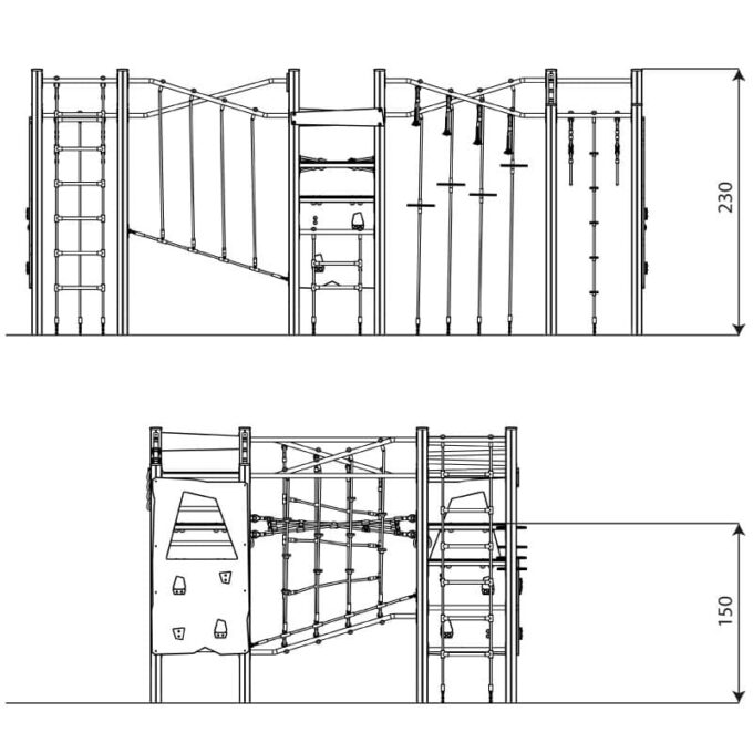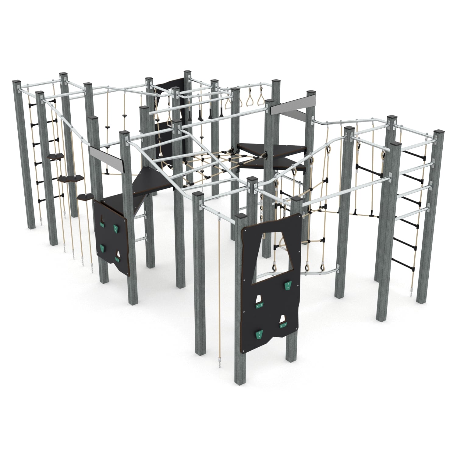 - Plattformen und Kletterwände aus langlebigem, rutschfestem und wasserfestem Sperrholz oder HPL-Platte,