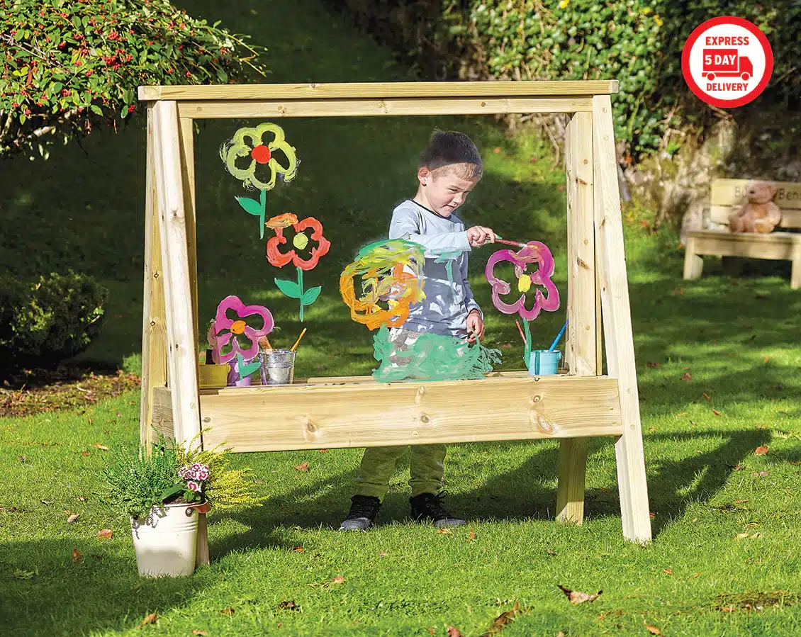 Die praktischen Ablageleisten auf beiden Seiten halten Kreide, Stifte und andere Materialien stets griffbereit. Diese Staffelei ist mehr als nur eine Malfläche; sie ist ein sozialer Treffpunkt, ein Werkzeug zur Förderung des Selbstausdrucks und eine äußerst langlebige Bereicherung für jeden Schulhof, Spielplatz oder Garten. Vollständig montiert geliefert und mit einer 10-jährigen Garantie auf das Holz versehen, kann der kreative Spaß sofort beginnen.
