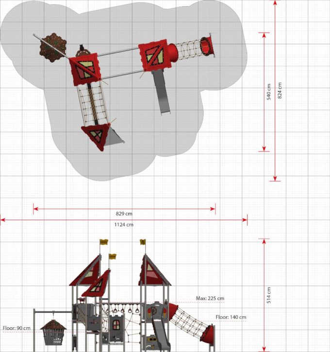 - Platzbedarf inkl. Sicherheitsabstände (LxB): 1124 x 824 cm