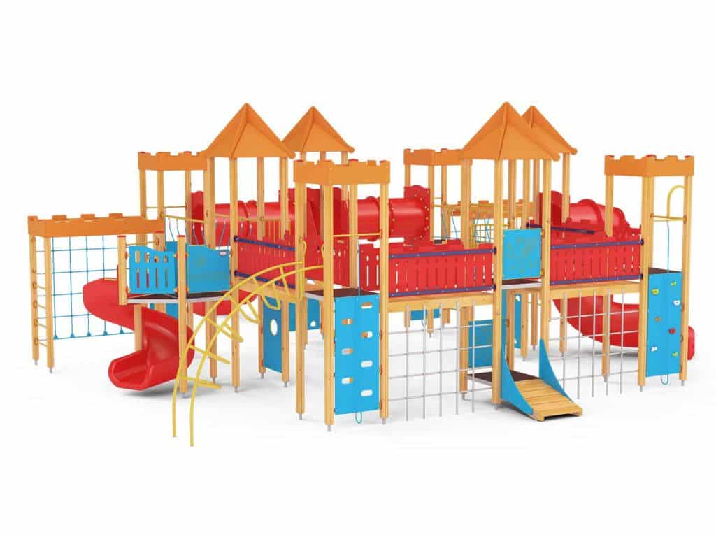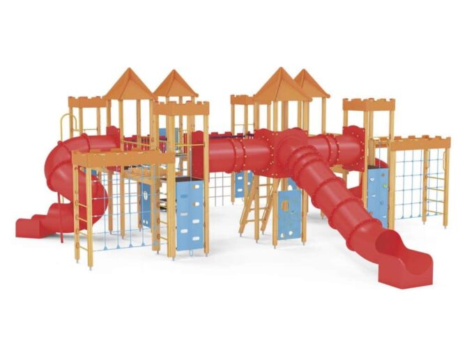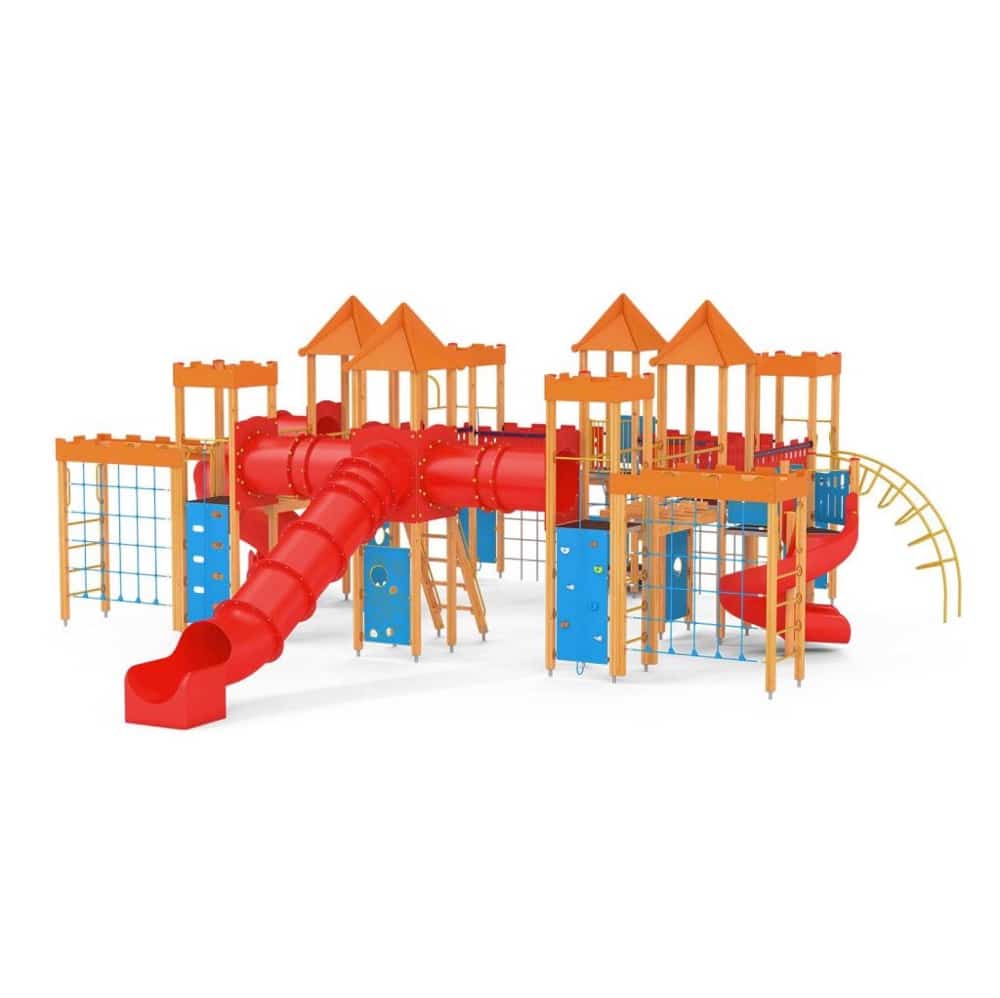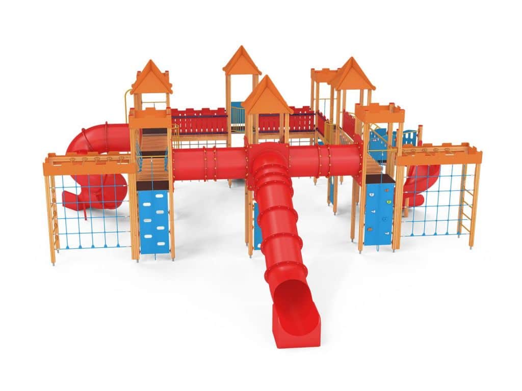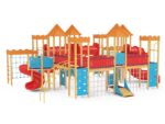 Quadro 450 Große Spielanlage, geeignet für bis zu 70 Kinder. Spielanlage mit Türmen, Rutschen, verschiedenen Kletterelementen.