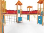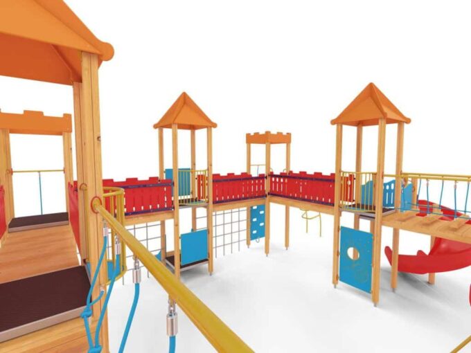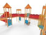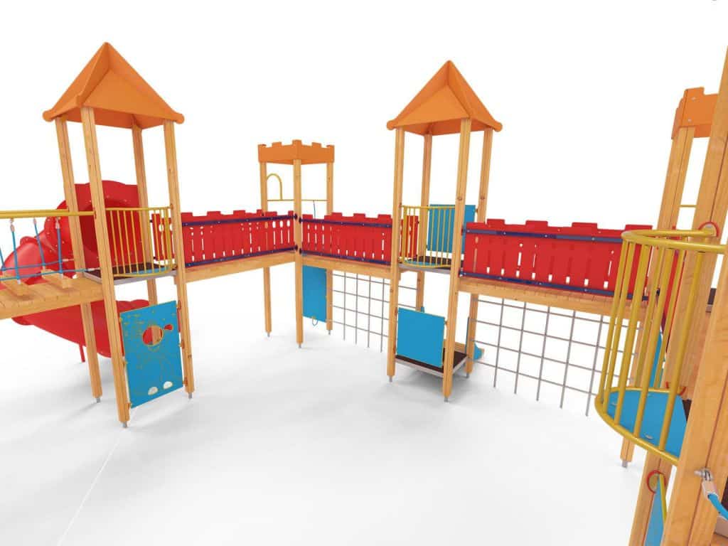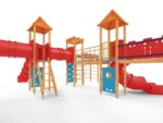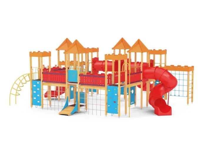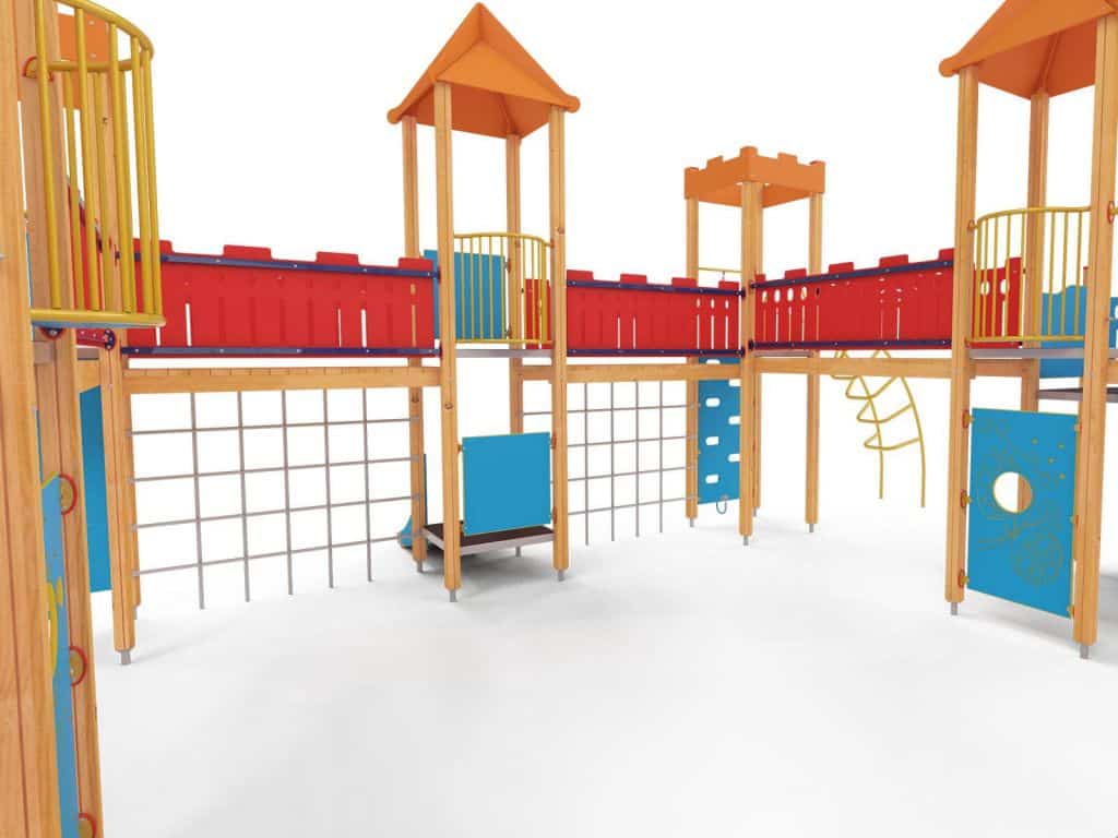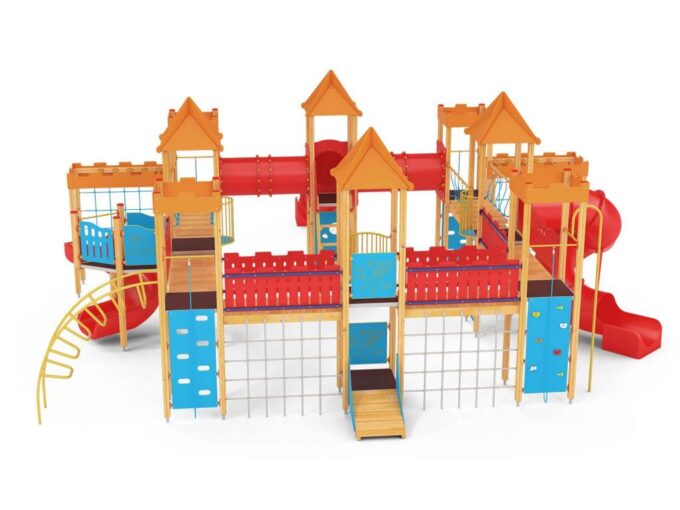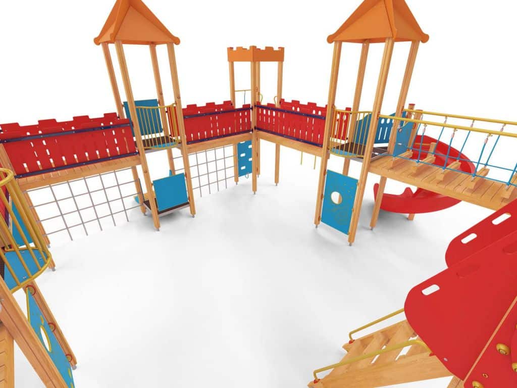 Quadro 450 Große Spielanlage, geeignet für bis zu 70 Kinder. Spielanlage mit Türmen, Rutschen, verschiedenen Kletterelementen.