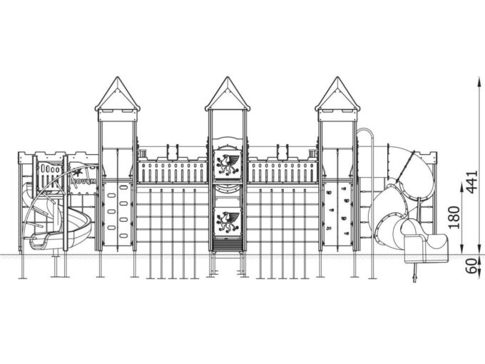 - Material: Pfosten aus Brettschichtholz, Verankerung aus Stahl, Überdachungen, Seitenwände, Geländer aus witterungsbeständigem HDPE. Stahlelemente sind feuerverzinkt und pulverlackiert. Seile aus Polypropylen mit Stahlkern, UV- beständig.