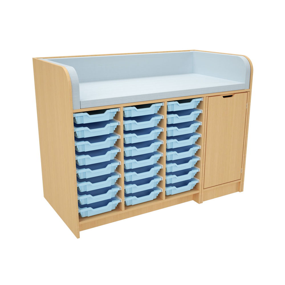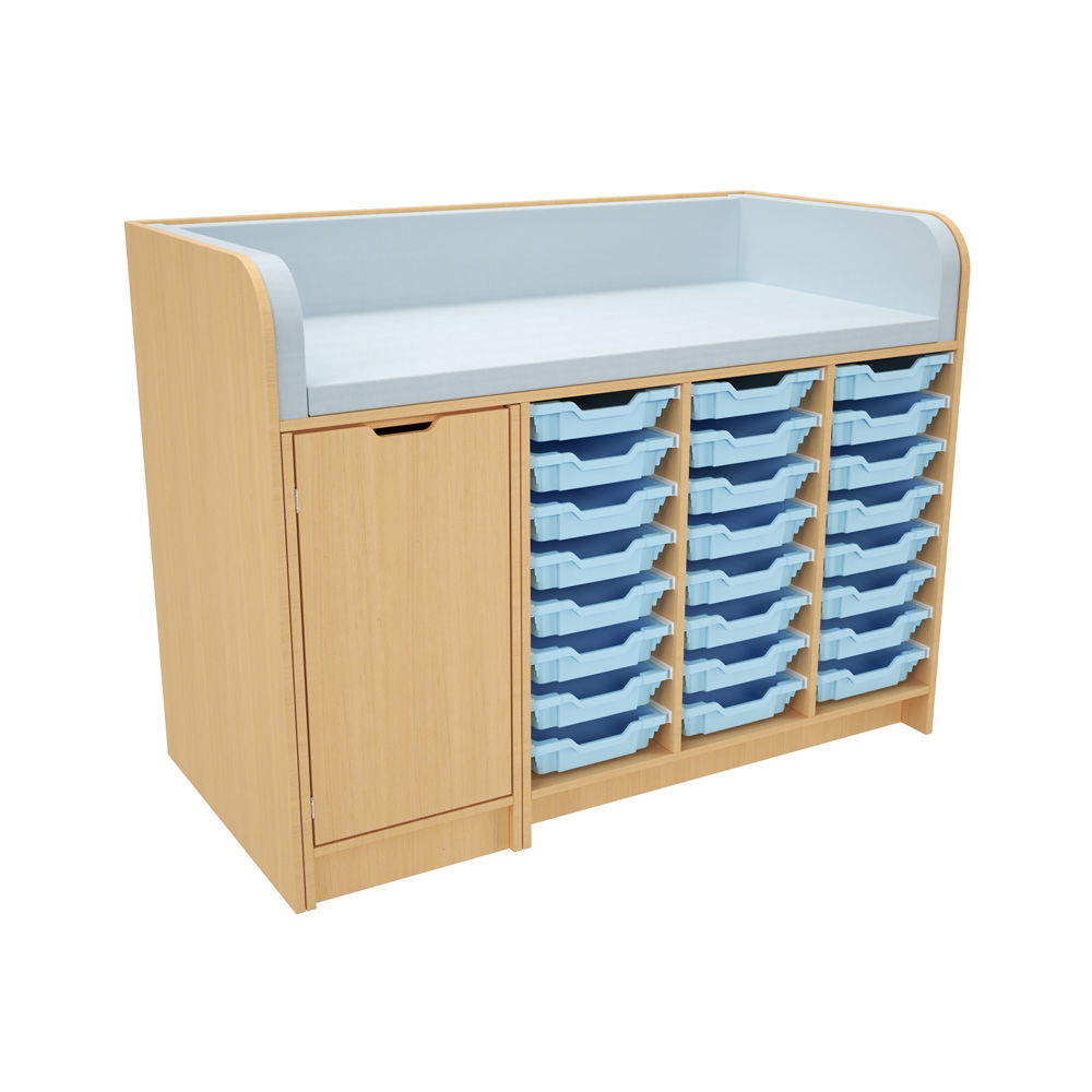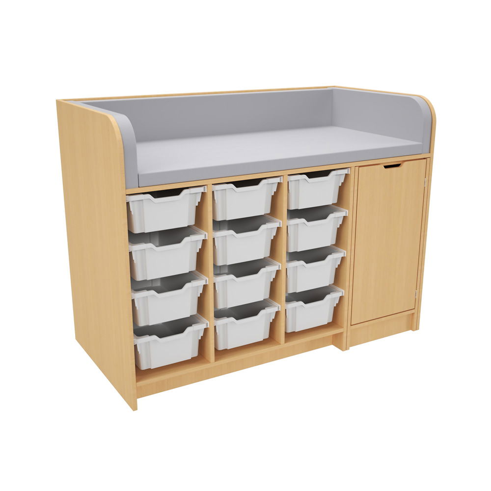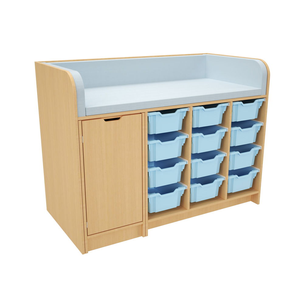Hinter der Tür und in den zahlreichen Regalfächern findet alles seinen Platz. Das System wird mit einer kompletten Ausstattung an hochwertigen Gratnells-Kunststoffbehältern geliefert (wahlweise 24 flache oder 12 mittlere Behälter). Ob Windeln, Feuchttücher, Wechselkleidung oder Pflegeprodukte – alles ist übersichtlich sortiert und sofort griffbereit. Das spart Zeit und sorgt für reibungslose Abläufe. - Hygienisch und extrem pflegeleicht