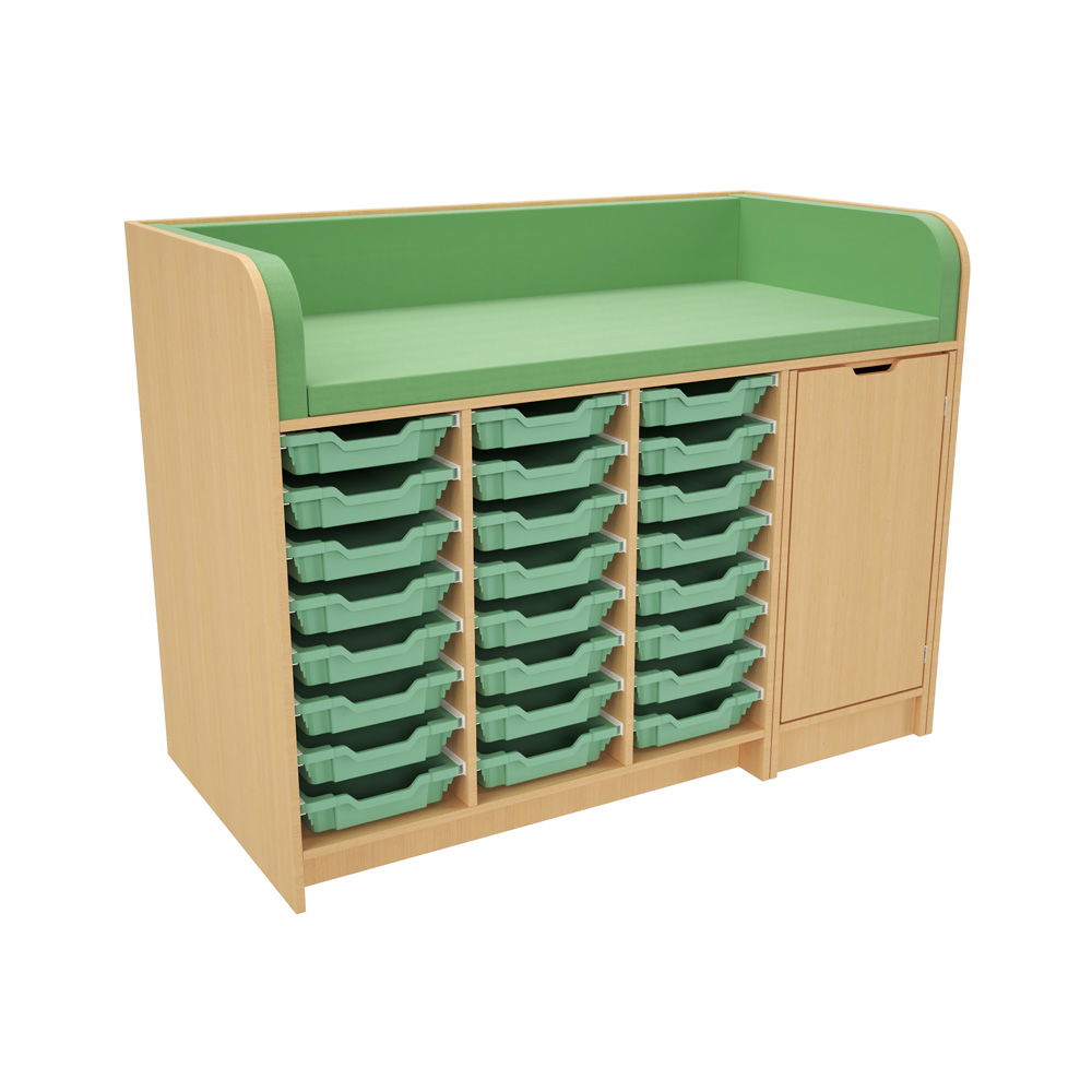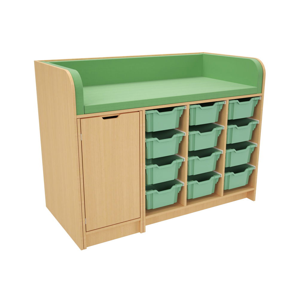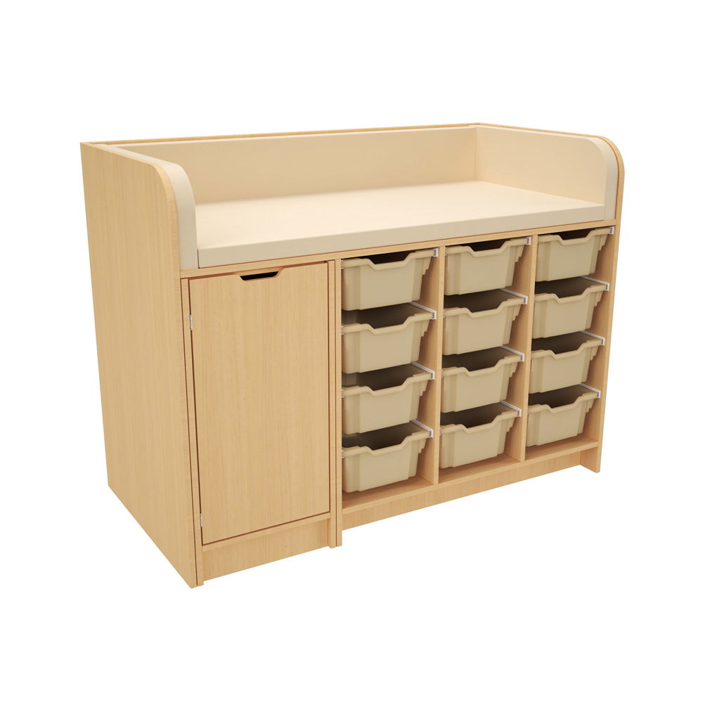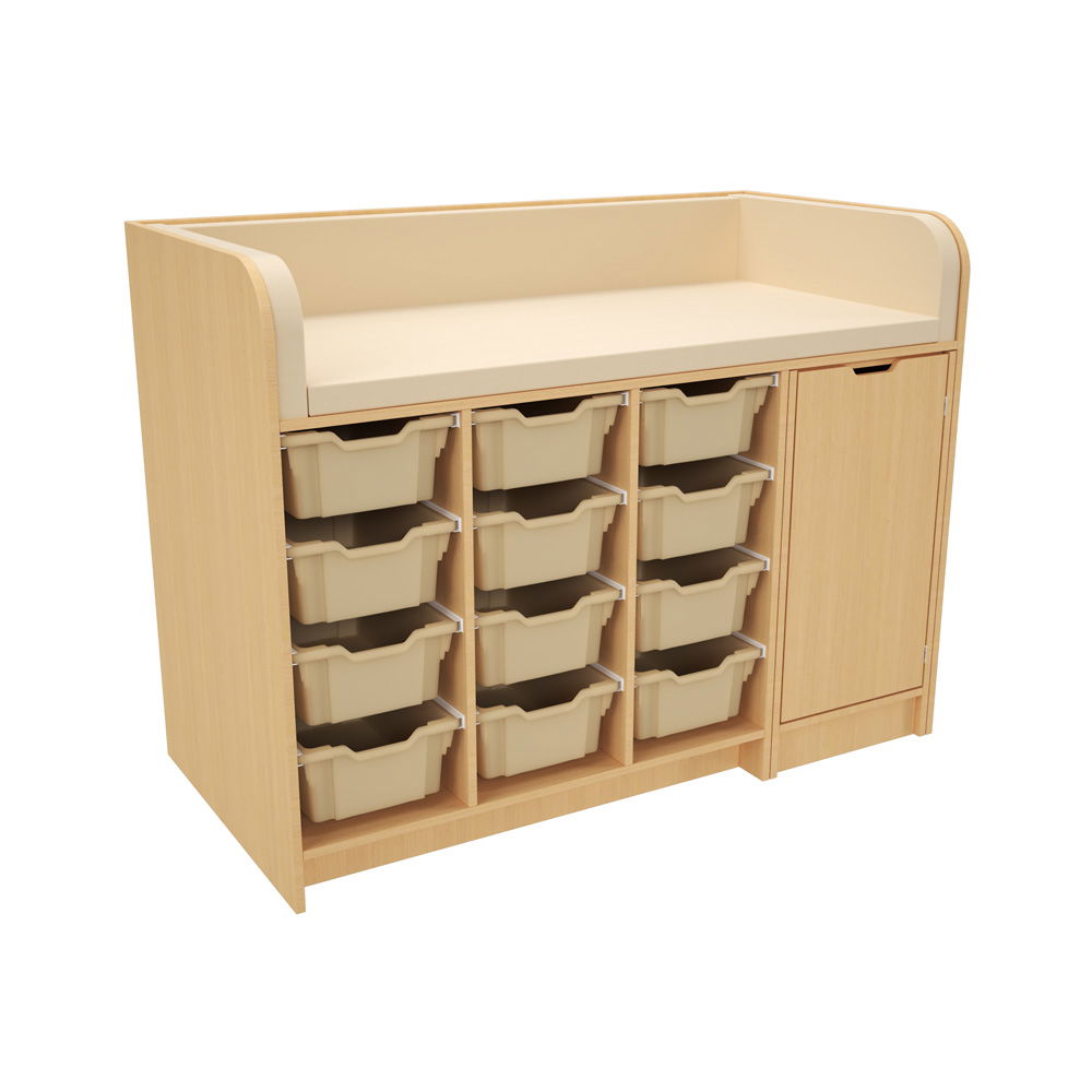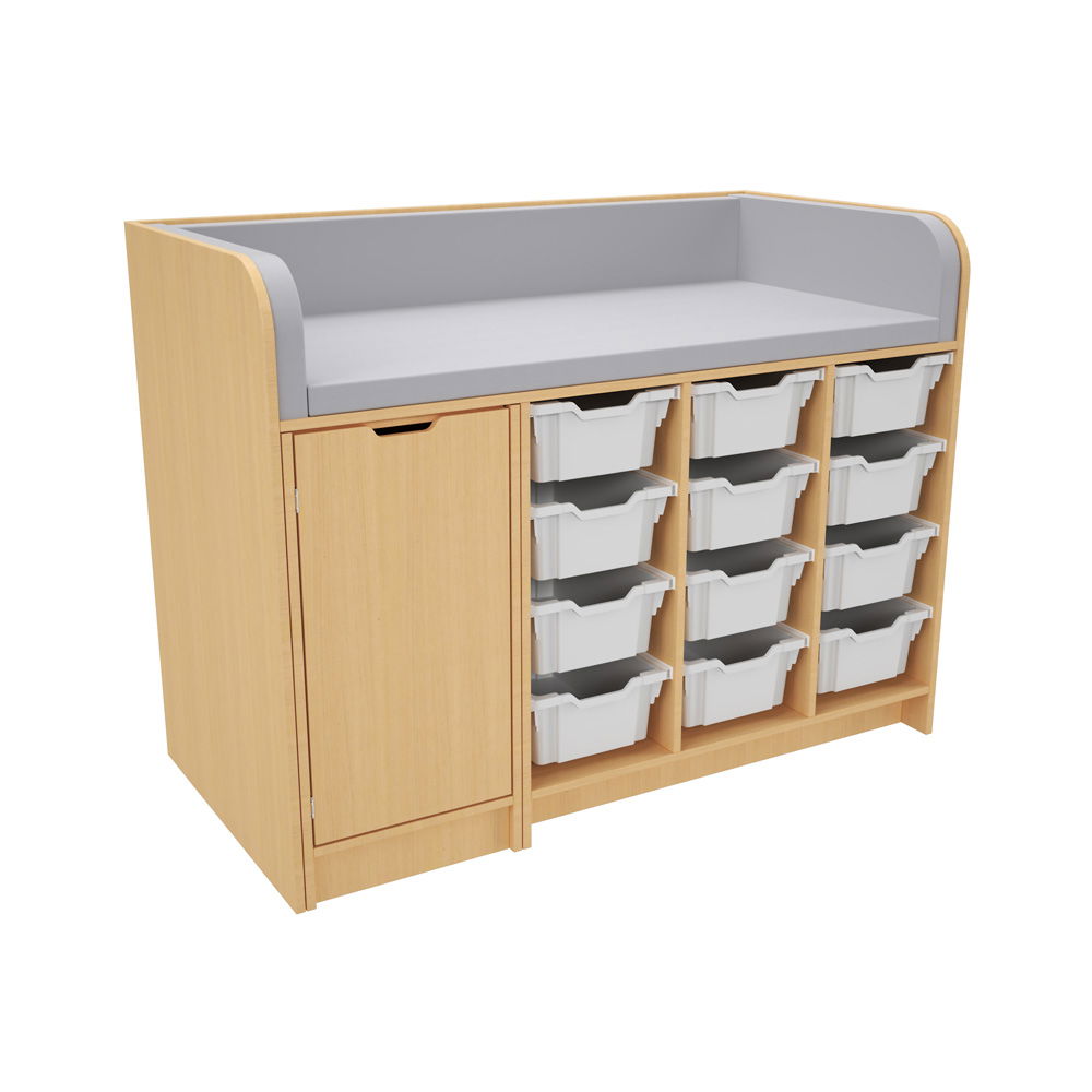 Hinter der Tür und in den zahlreichen Regalfächern findet alles seinen Platz. Das System wird mit einer kompletten Ausstattung an hochwertigen Gratnells-Kunststoffbehältern geliefert (wahlweise 24 flache oder 12 mittlere Behälter). Ob Windeln, Feuchttücher, Wechselkleidung oder Pflegeprodukte – alles ist übersichtlich sortiert und sofort griffbereit. Das spart Zeit und sorgt für reibungslose Abläufe. - Hygienisch und extrem pflegeleicht