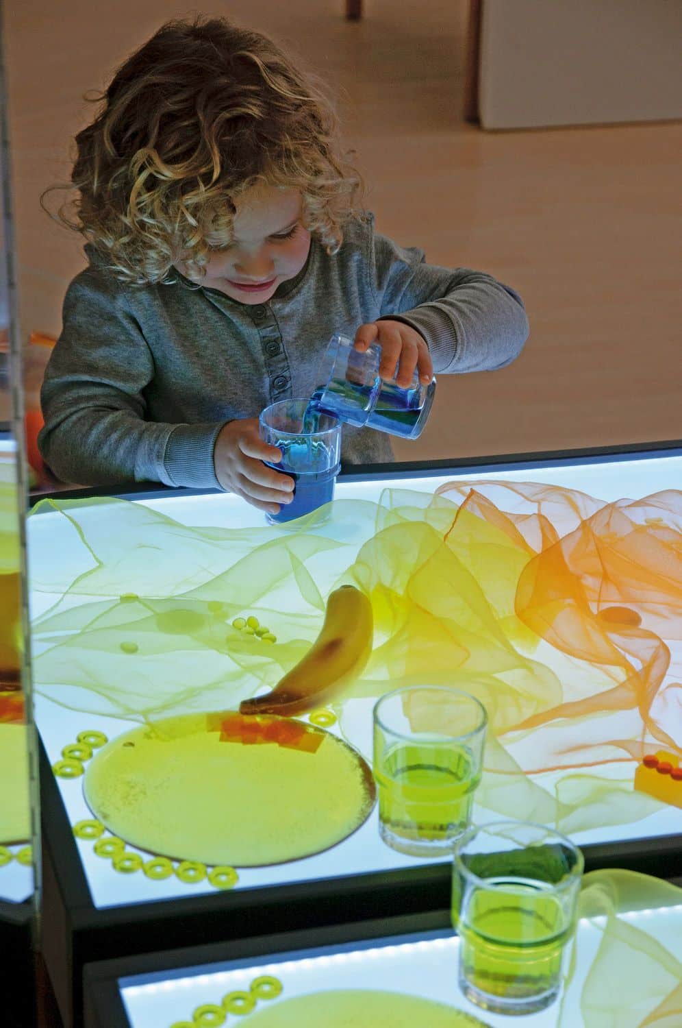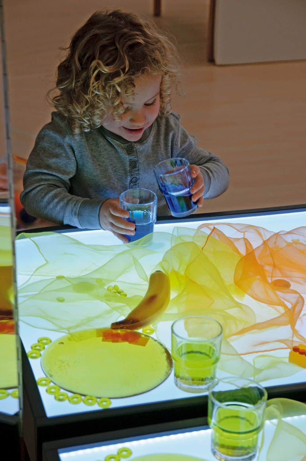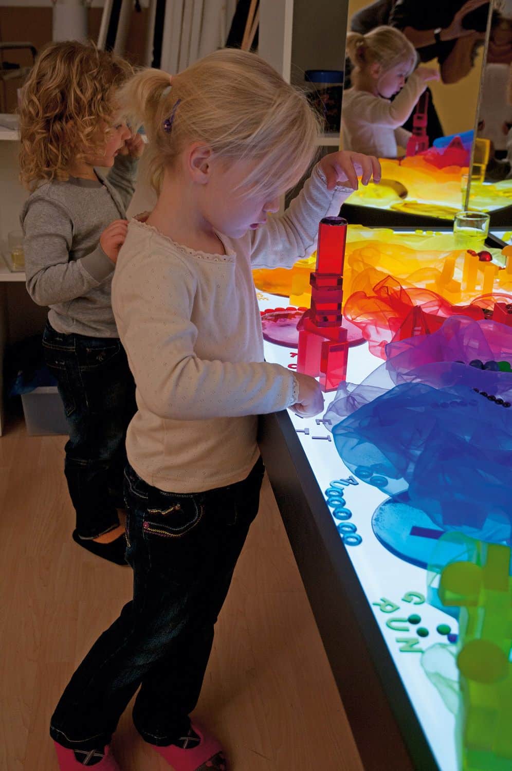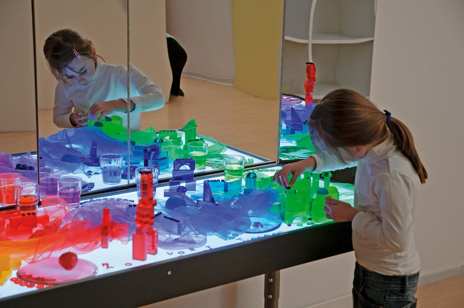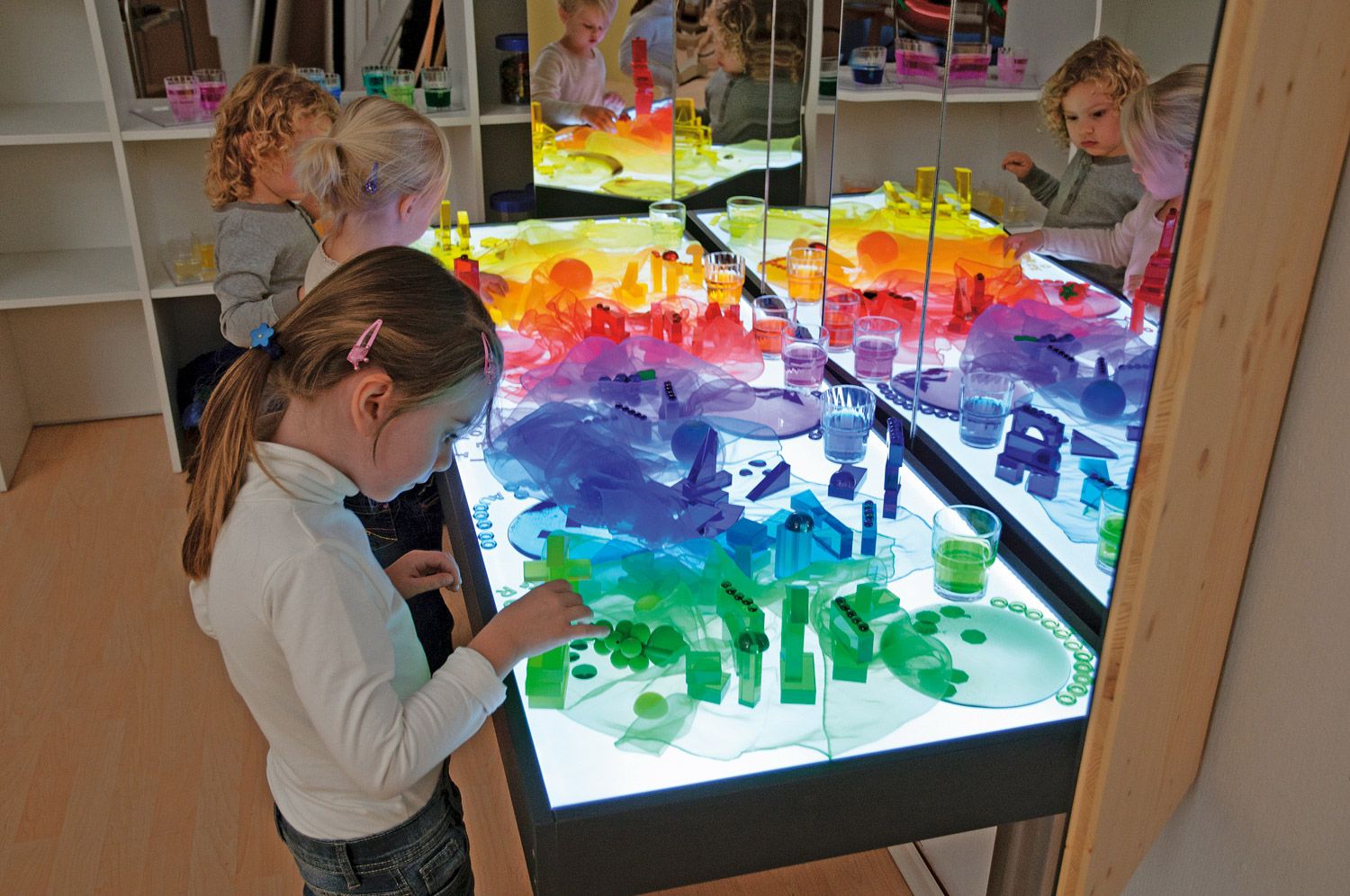 - Fördert Farbwahrnehmung und visuelle Exploration: Experimente mit transparenten Materialien, Folien oder Bildern werden unterstützt. Hier können erstaunliche Lichteffekte entstehen, die das Unsichtbare sichtbar machen.