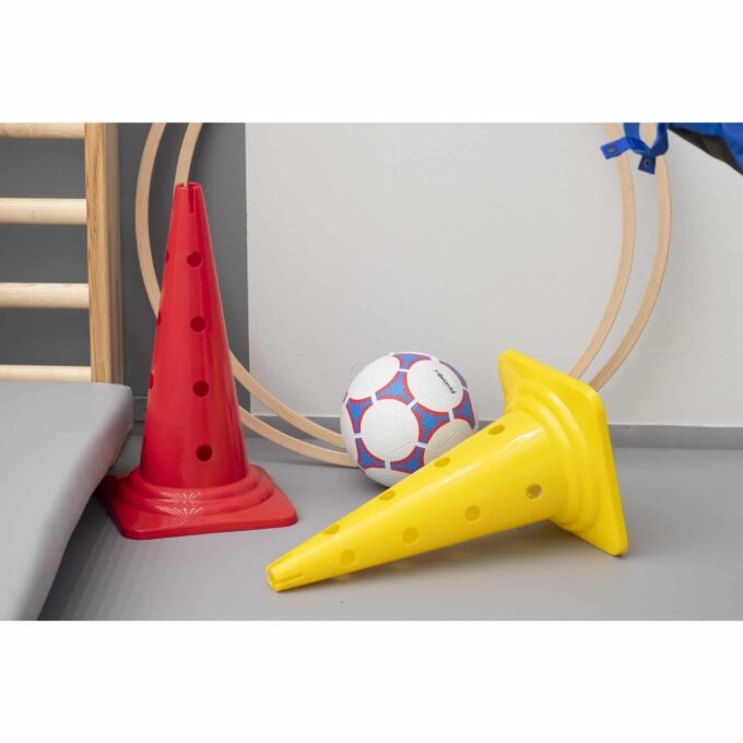 - Stapelbar: Nach dem Einsatz können die Kegel platzsparend verstaut werden – perfekt für Schulen oder Vereine mit begrenztem Stauraum.