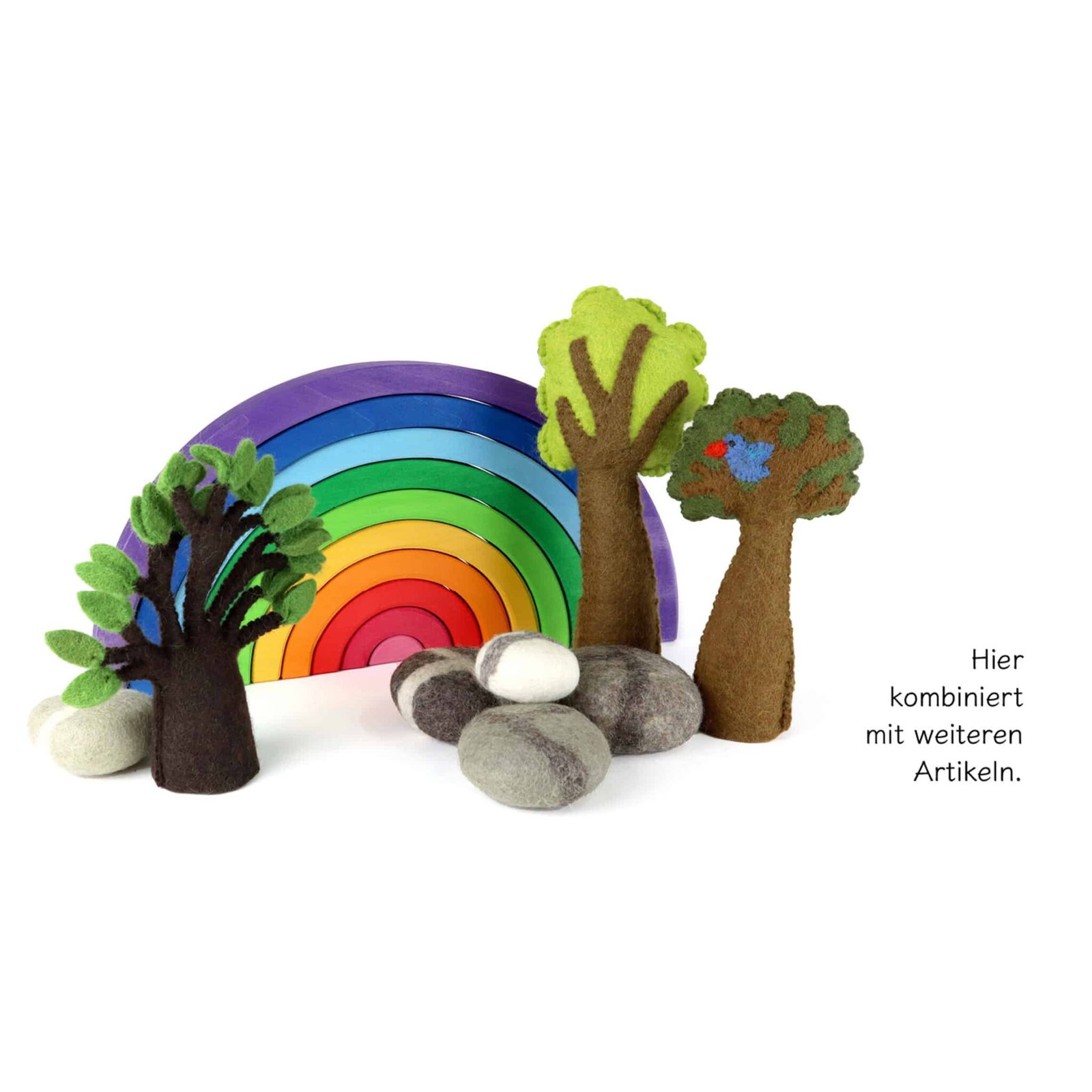 Der Große Regenbogen wird aus nachhaltigem Holz gefertigt und mit umweltfreundlicher Farbe behandelt. Jedes Teil ist sorgfältig gestaltet, um sowohl Robustheit als auch Sicherheit zu bieten. Die glatten Oberflächen sind angenehm in der Hand und garantieren ein sorgenfreies Spielerlebnis. Eltern können sich darauf verlassen, dass ihre Kinder mit einem Produkt spielen, das höchsten Sicherheitsstandards entspricht.