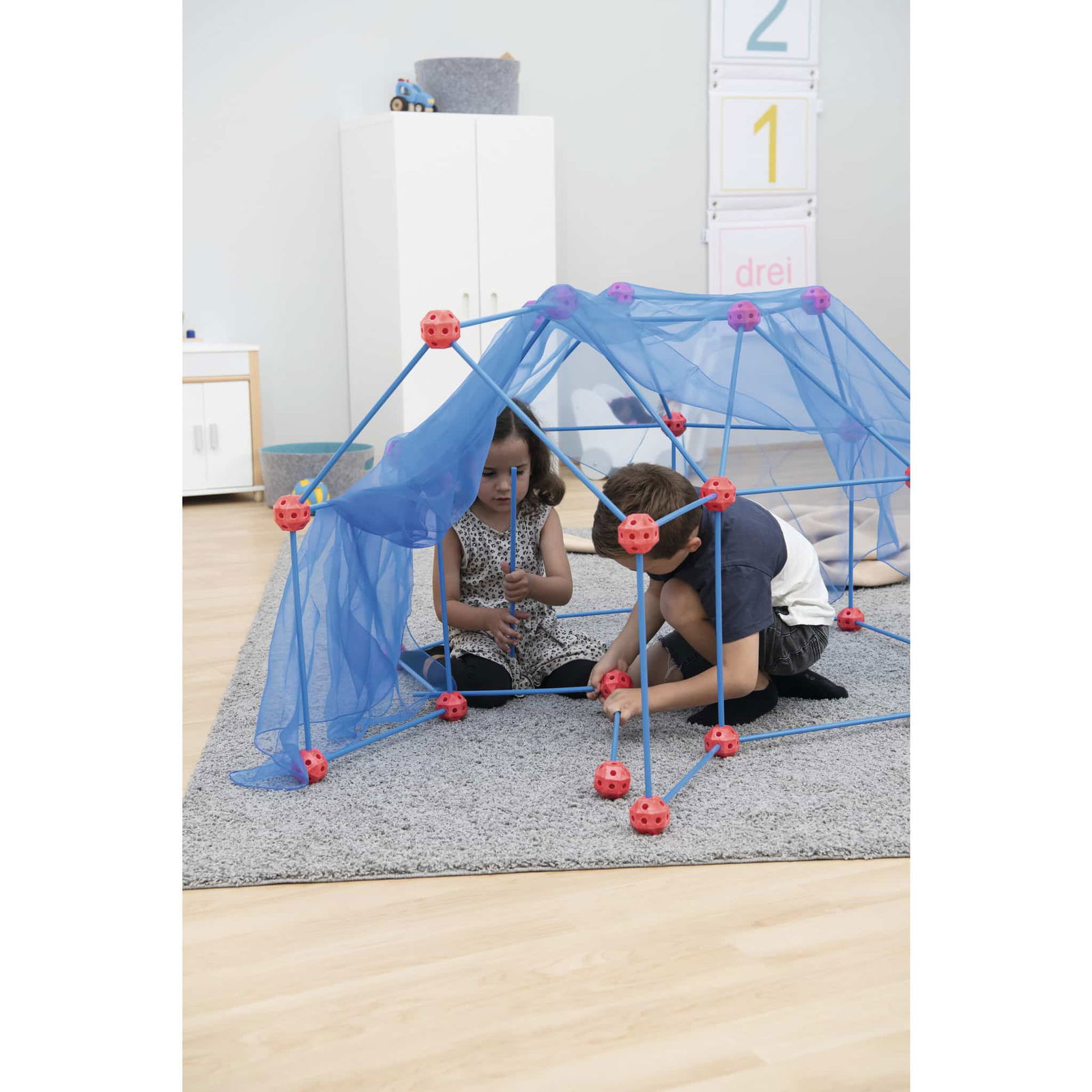 Mit dem großen Steckbaukasten XXL wird Geometrie nicht nur theoretisch behandelt, sondern praktisch erlebbar gemacht. Kinder können die Modelle nicht nur von außen betrachten, sondern auch hineinkriechen und die Strukturen von innen bestaunen. Diese interaktive Herangehensweise fördert das Verständnis für geometrische Konzepte und macht das Lernen zu einem aktiven Erlebnis!