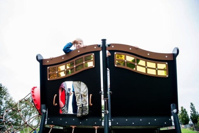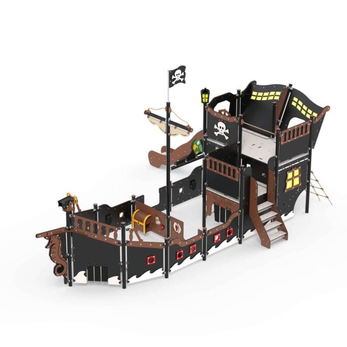 Außerdem gibt es auf allen Seiten der Kajüte große Fenster, damit die Erwachsenen die Kinder im Auge behalten können, ohne sie beim Spielen zu stören. Die Schiffe dieser Größe verfügen auch über einen großen Mast und einen Papagei, der dem Schiff den letzten Schliff verleiht.