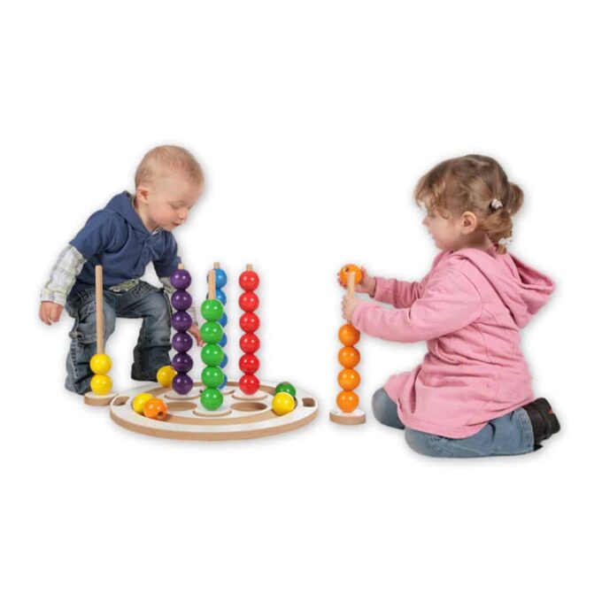 - Durch das sequenzielle Aufstecken der Kugeln – erst eine, dann zwei und so weiter – entwickeln die Kinder ein Verständnis für Menge und Größe.