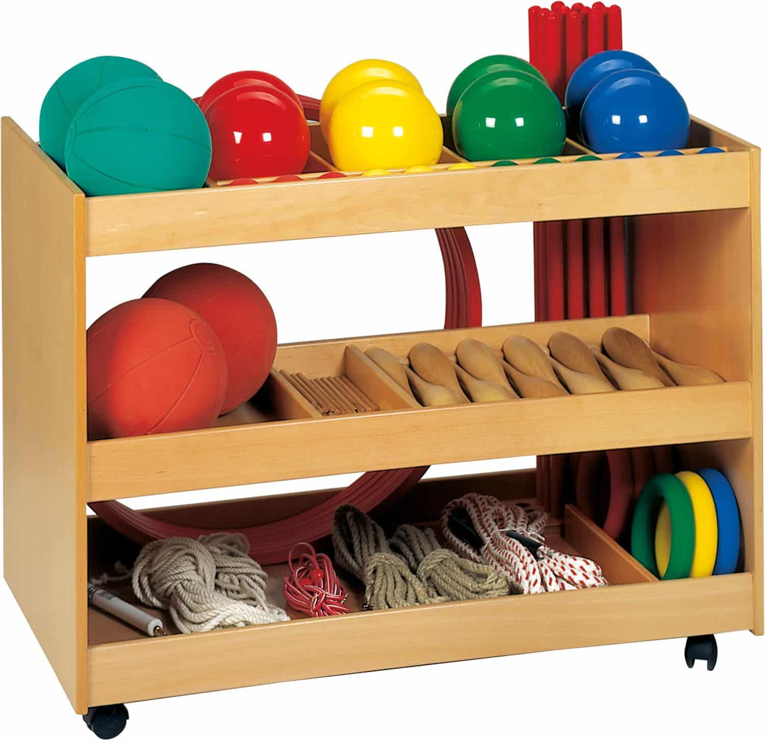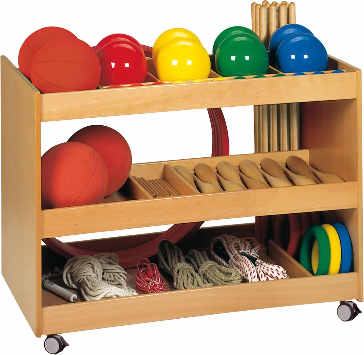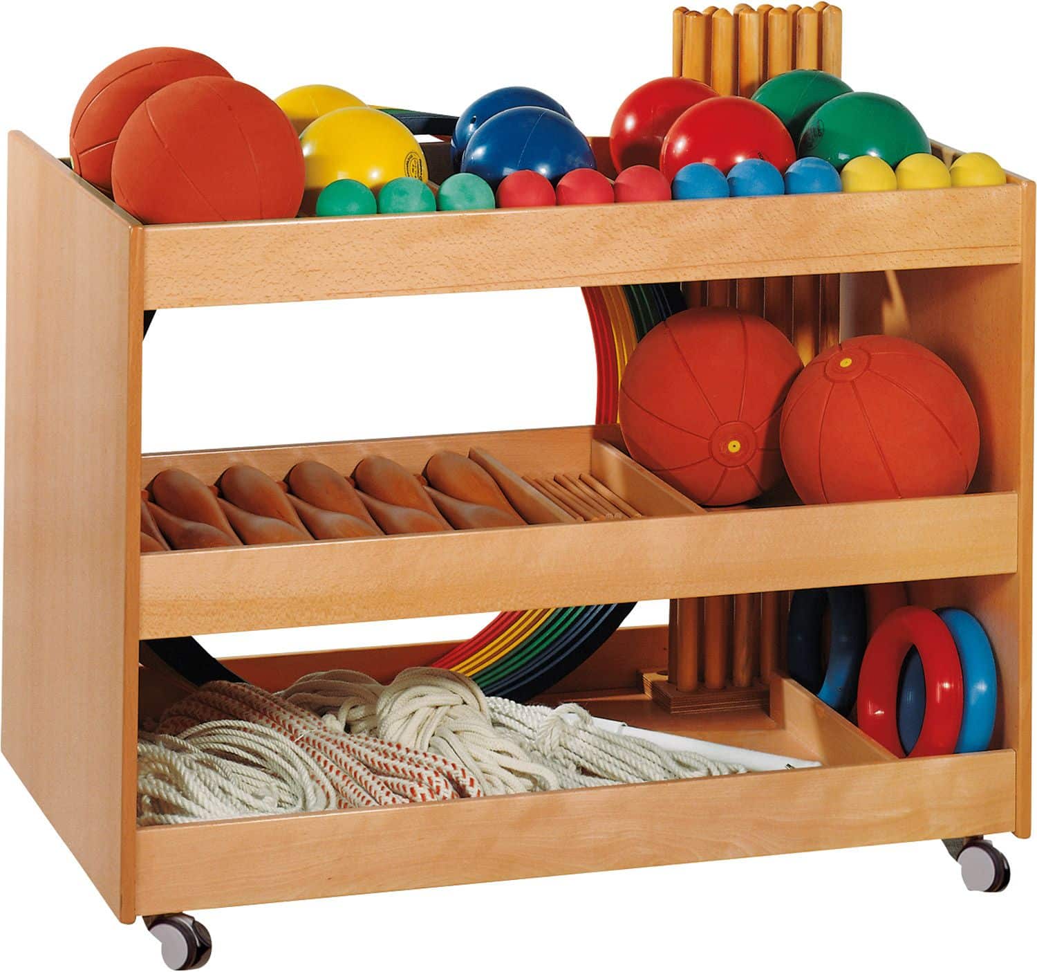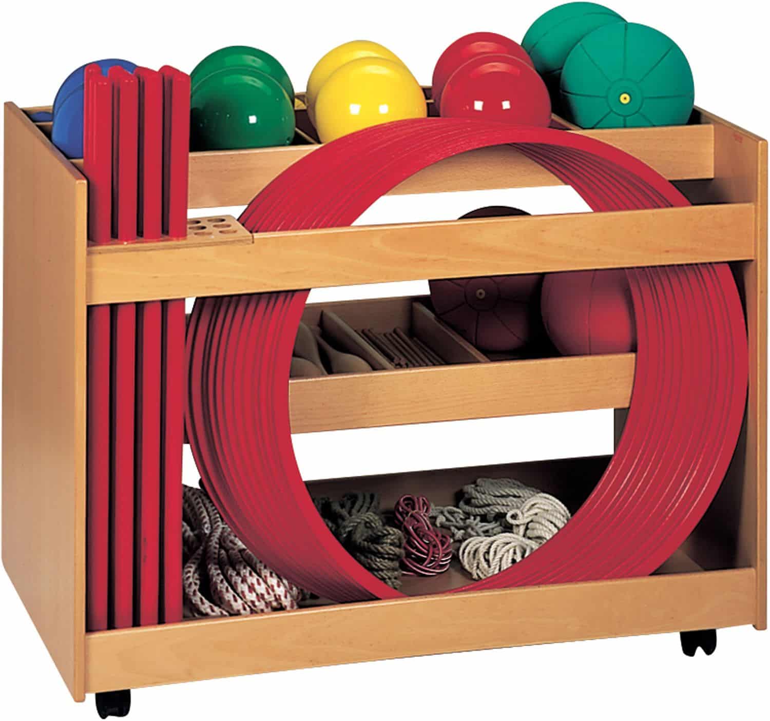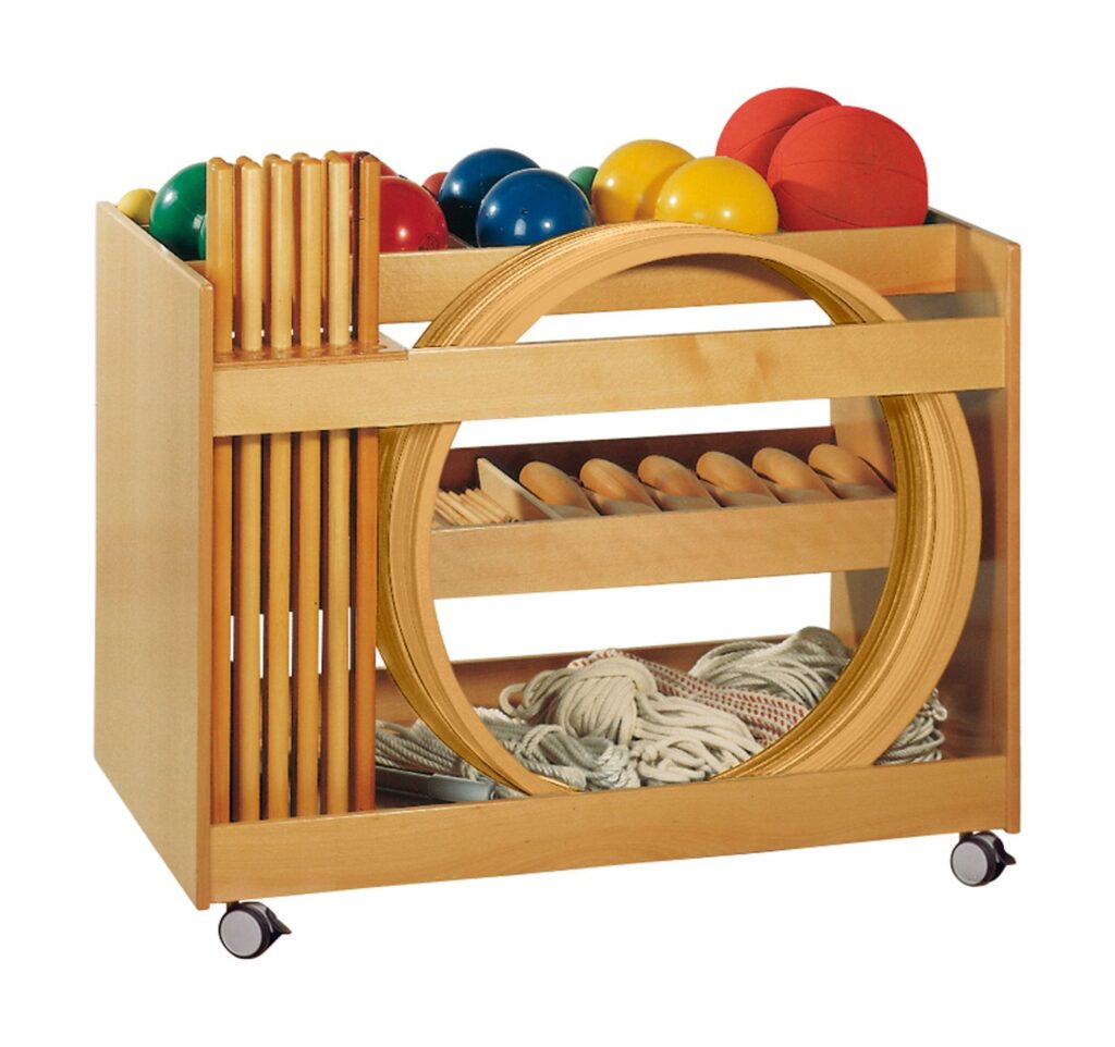 Die durchdachte Platzeinteilung bietet ausreichend Platz für eine Vielzahl an Gymnastikmaterialien, darunter Gymnastiksäckchen, Reifen- und Stabständer. Auch die Standard-Bestückung (568 070) findet hier bequem Platz. Die vier Rollen, von denen zwei feststellbar sind, sorgen für flexible Einsatzmöglichkeiten und einfaches Manövrieren.