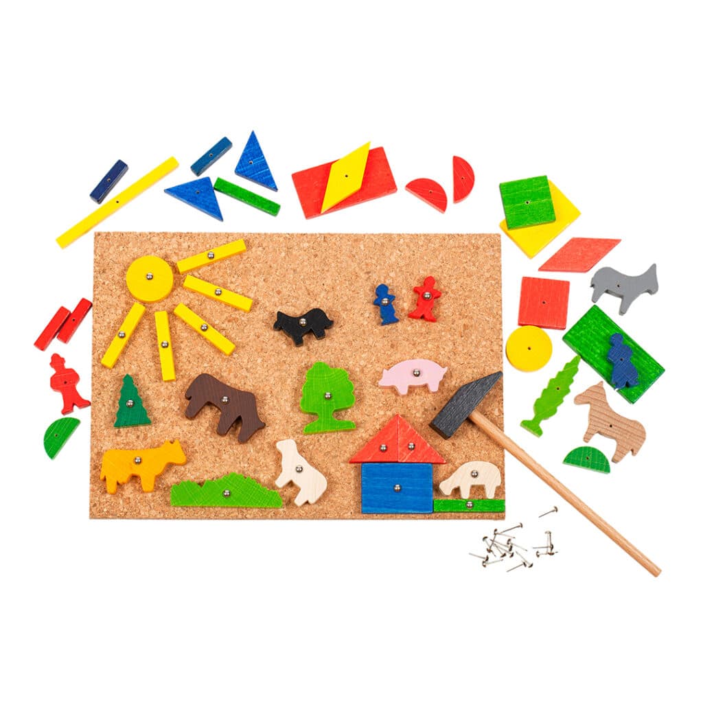 Im Lieferumfang enthalten sind: eine Korkplatte als weiche Unterlage, ein kindgerechtes Holzhämmerchen, 46 verschiedene Holztäfelchen zum fantasievollen Zusammenstellen und ein Beutelchen mit Nägeln, deren Spitzen kindersicher abgerundet sind.