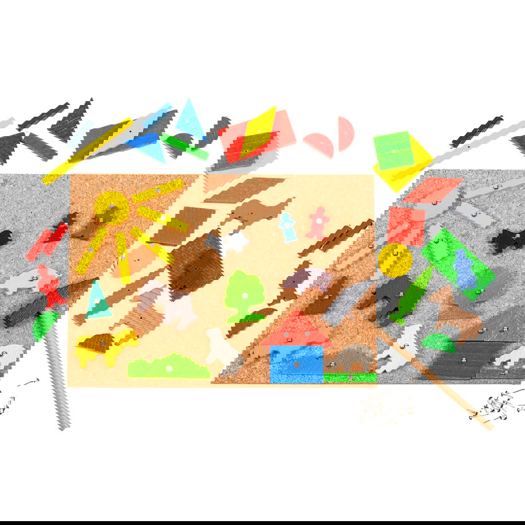 - Inhalt: 1 Korkplatte, 1 Holzhämmerchen, 46 verschiedene Holztäfelchen, 1 Tütchen mit Nägeln (Kuppen abgerundet).