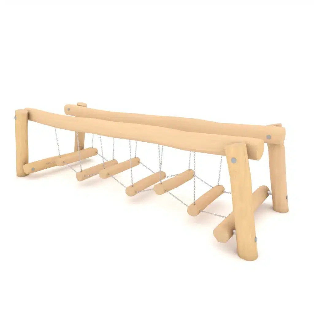 Abenteuerliche Hängebrücke (EN 1176) aus massivem Robinienholz. Fördert Gleichgewicht & Mut. Langlebig, sicher & ideal für naturnahe öffentliche Spielplätze.